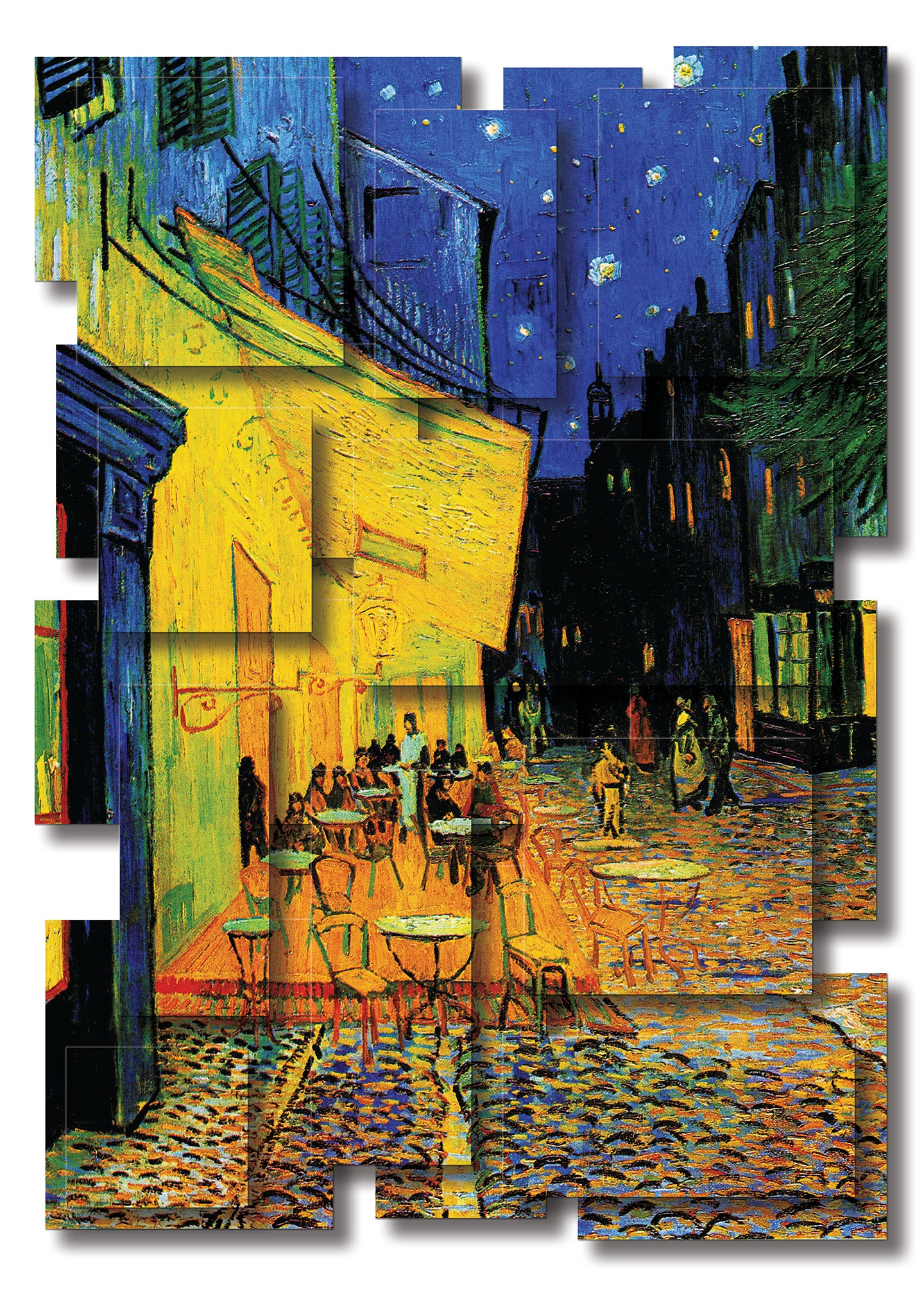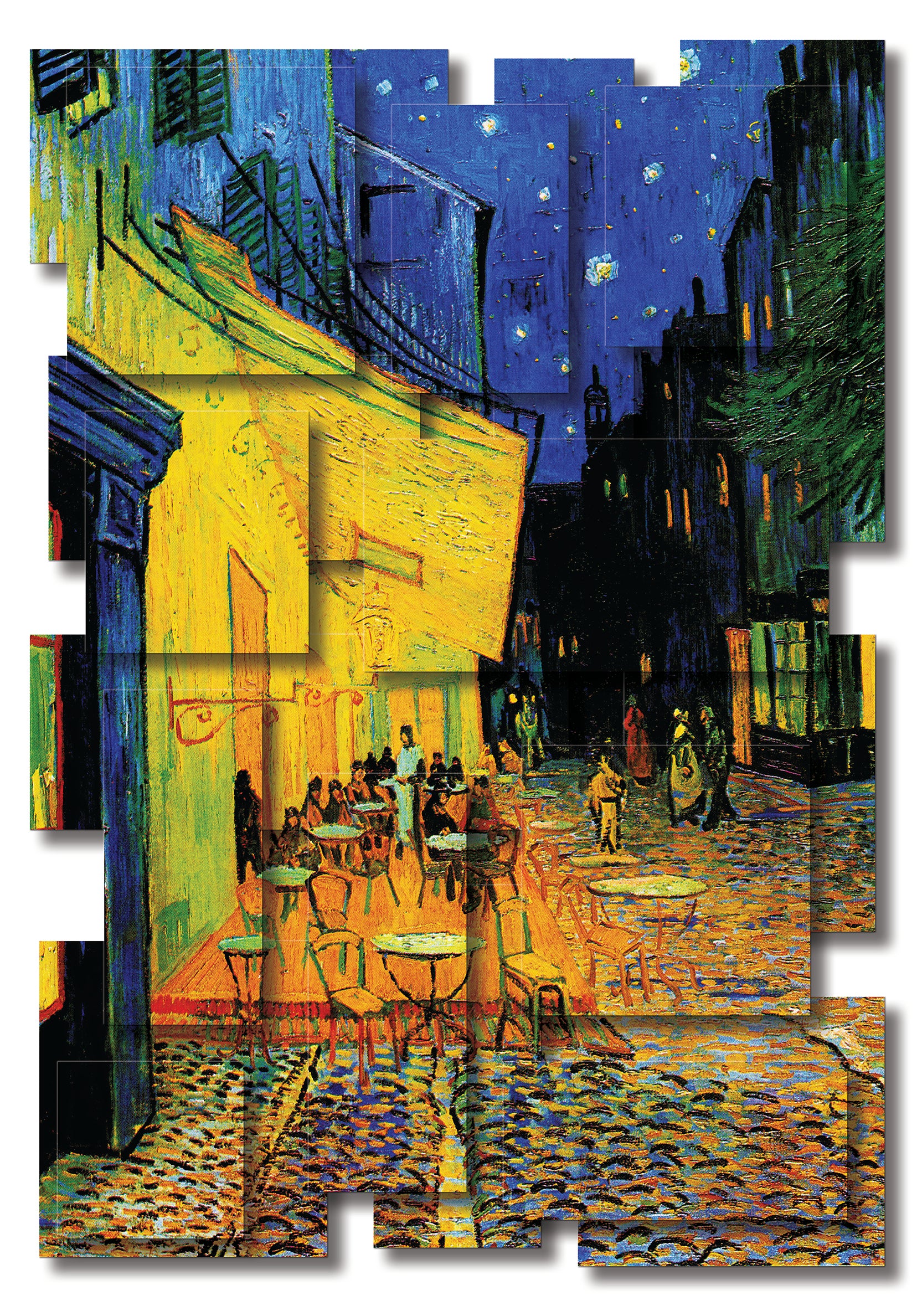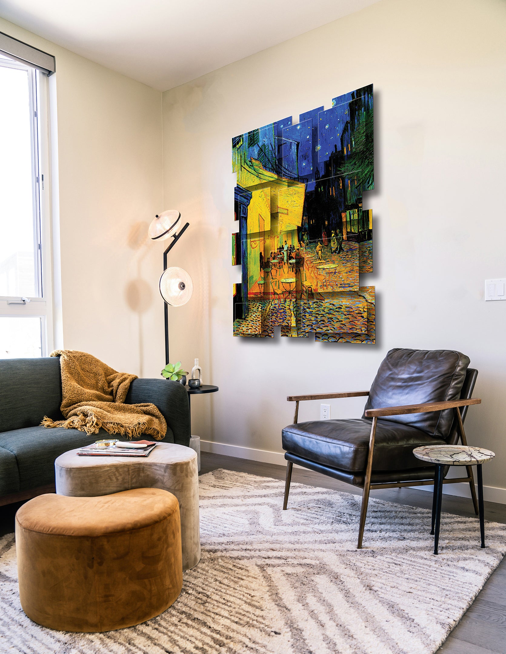 "This artwork, painted with Vincent van Gogh’s signature brushwork, captures a vibrant evening scene in a café-lined street. The terrace, bathed in golden light, glows warmly against the deep blues of the night sky, where stars twinkle in rhythmic bursts of white. Figures seated at small round tables create a sense of quiet social energy, while passersby in the darker street beyond contrast the illuminated café with mystery and shadow. The cobblestones, rendered in textured strokes of blue, yellow, and green, ripple with movement, guiding the viewer’s gaze inward. The piece balances intimacy and vastness—anchoring human presence in the cozy café while opening outward to the infinite, starlit sky."