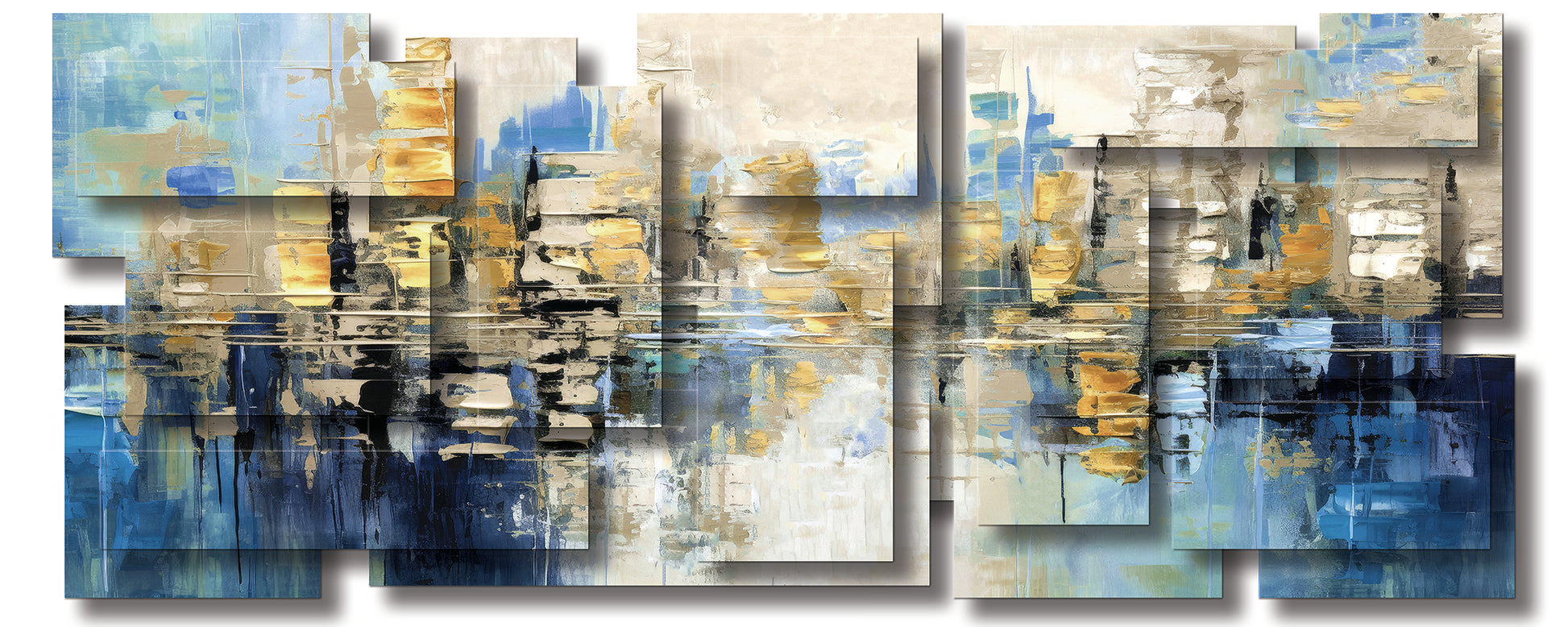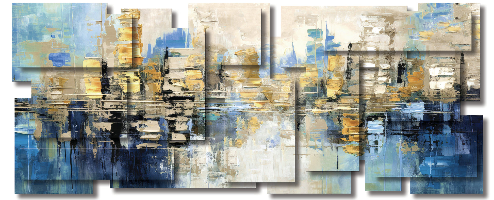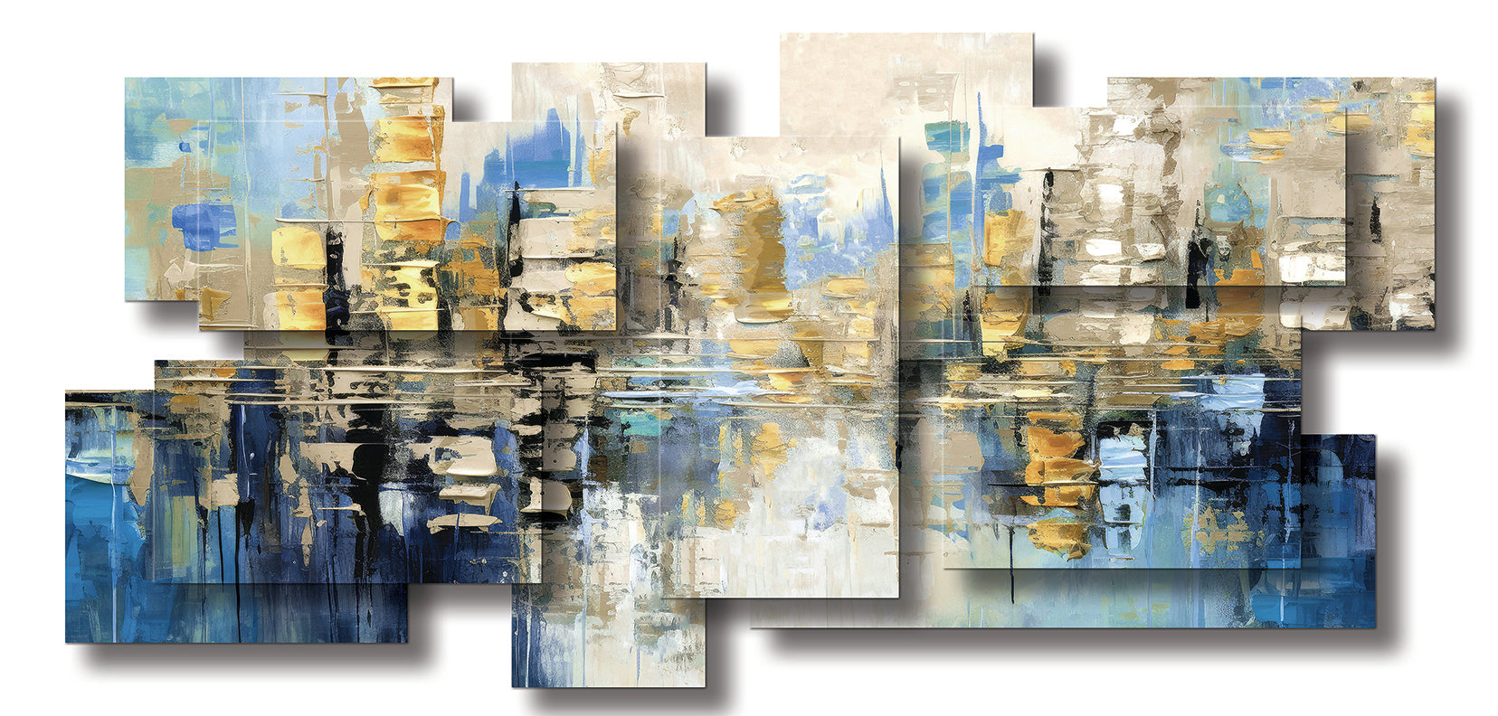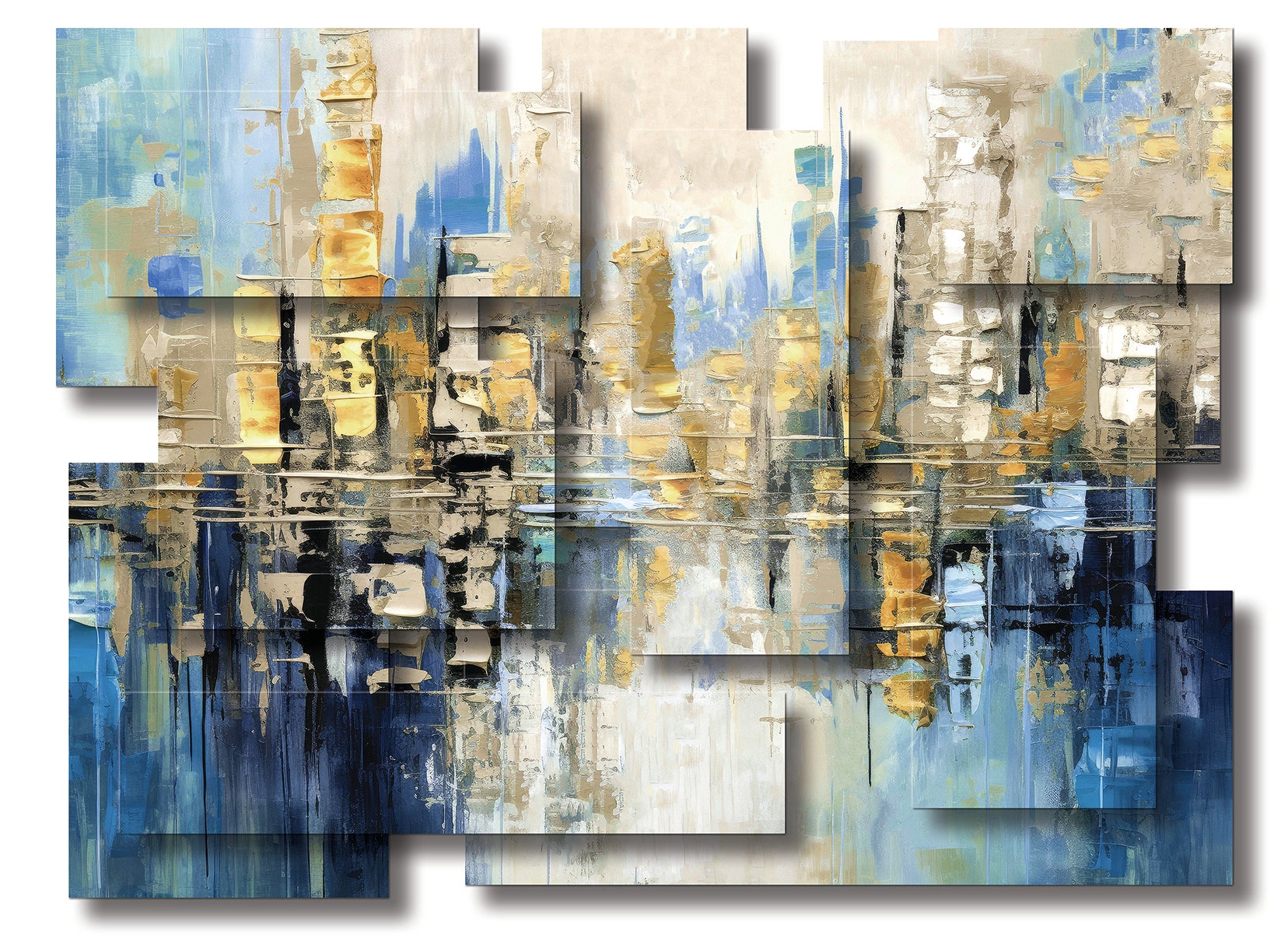 "Golden strokes rise like towers against washes of blue, forming a luminous abstract cityscape energy of urban light and the serenity of sky and water. Reflected below in a rippling movement, the skyline blurs into water and light, balancing solidity with dreamlike transience. It is a city that feels both familiar and otherworldly, bustling yet meditative, a glowing tribute to the luminous rhythm of urban life."