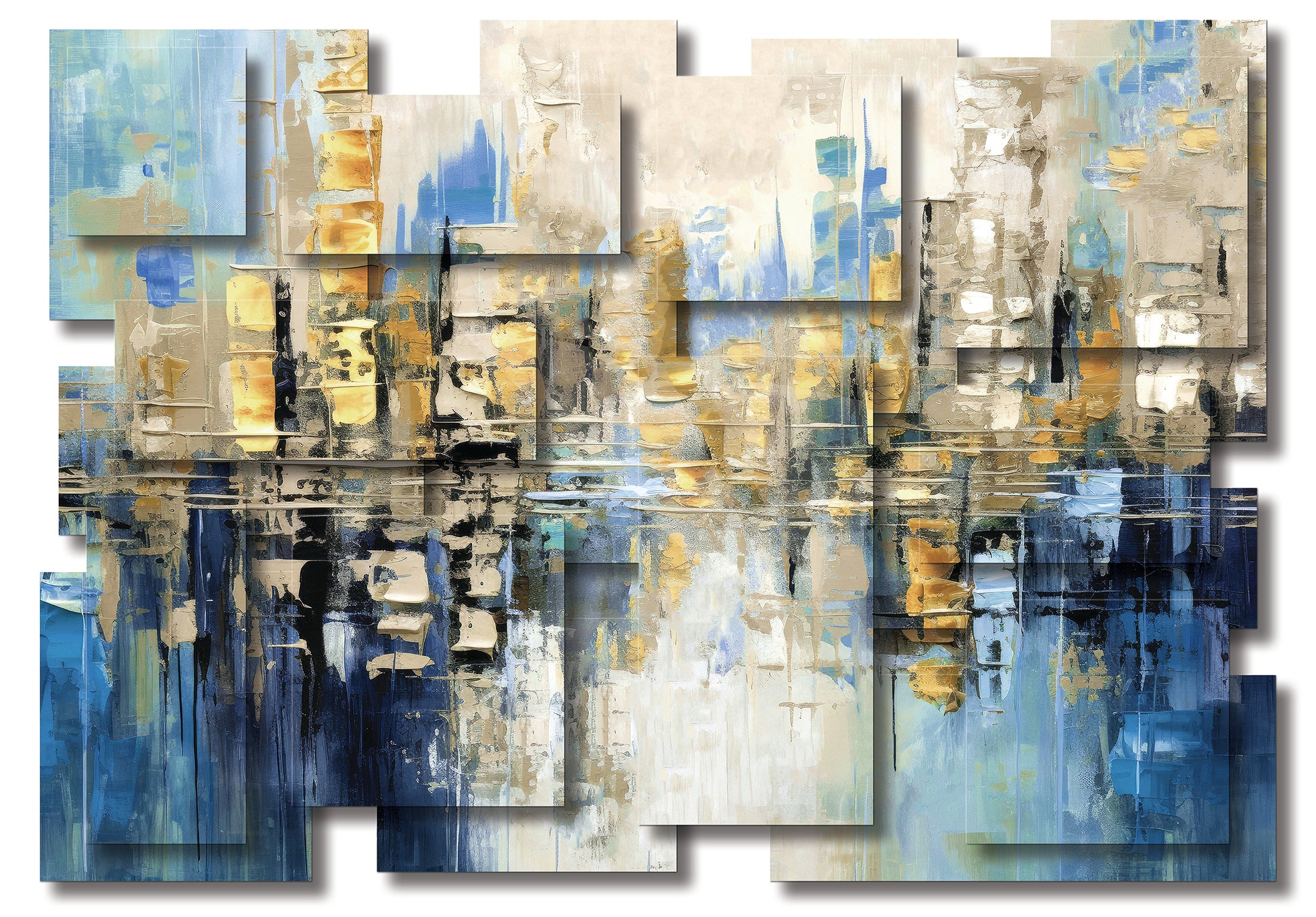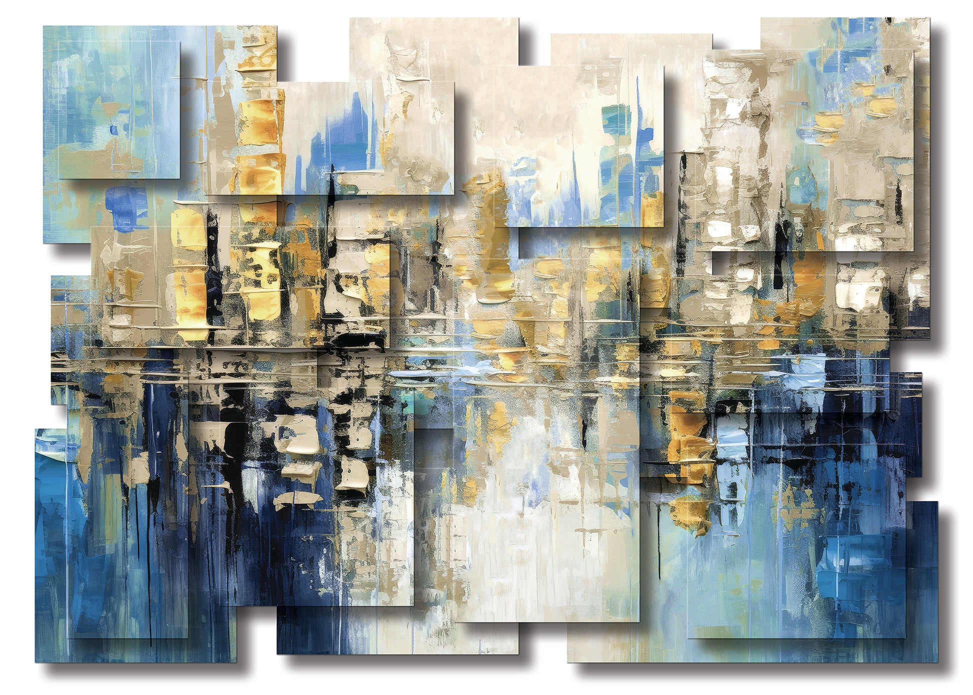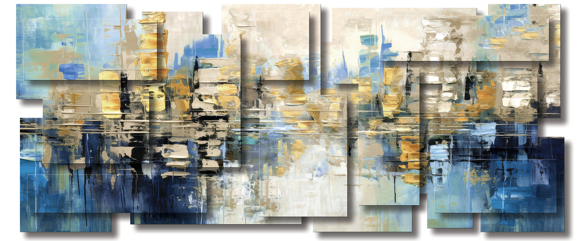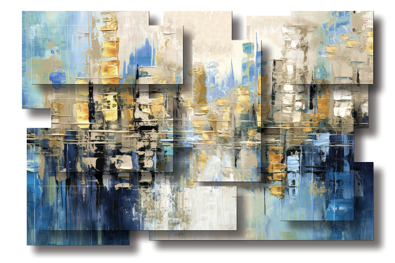 "Golden strokes rise like towers against washes of blue, forming a luminous abstract cityscape energy of urban light and the serenity of sky and water. Reflected below in a rippling movement, the skyline blurs into water and light, balancing solidity with dreamlike transience. It is a city that feels both familiar and otherworldly, bustling yet meditative, a glowing tribute to the luminous rhythm of urban life."