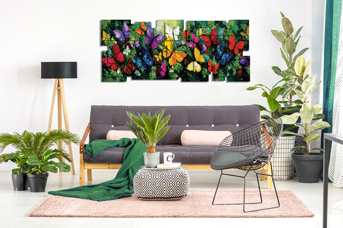 "A vivid swarm of butterflies bursts across a textured garden of greens, their wings rendered in bold strokes of color. Painted with a palette knife, the impasto surface radiates movement and light, transforming the scene into a celebration of color, freedom, and fleeting beauty."