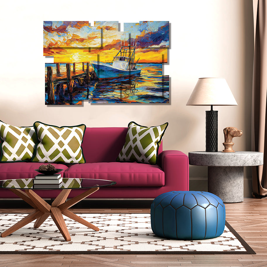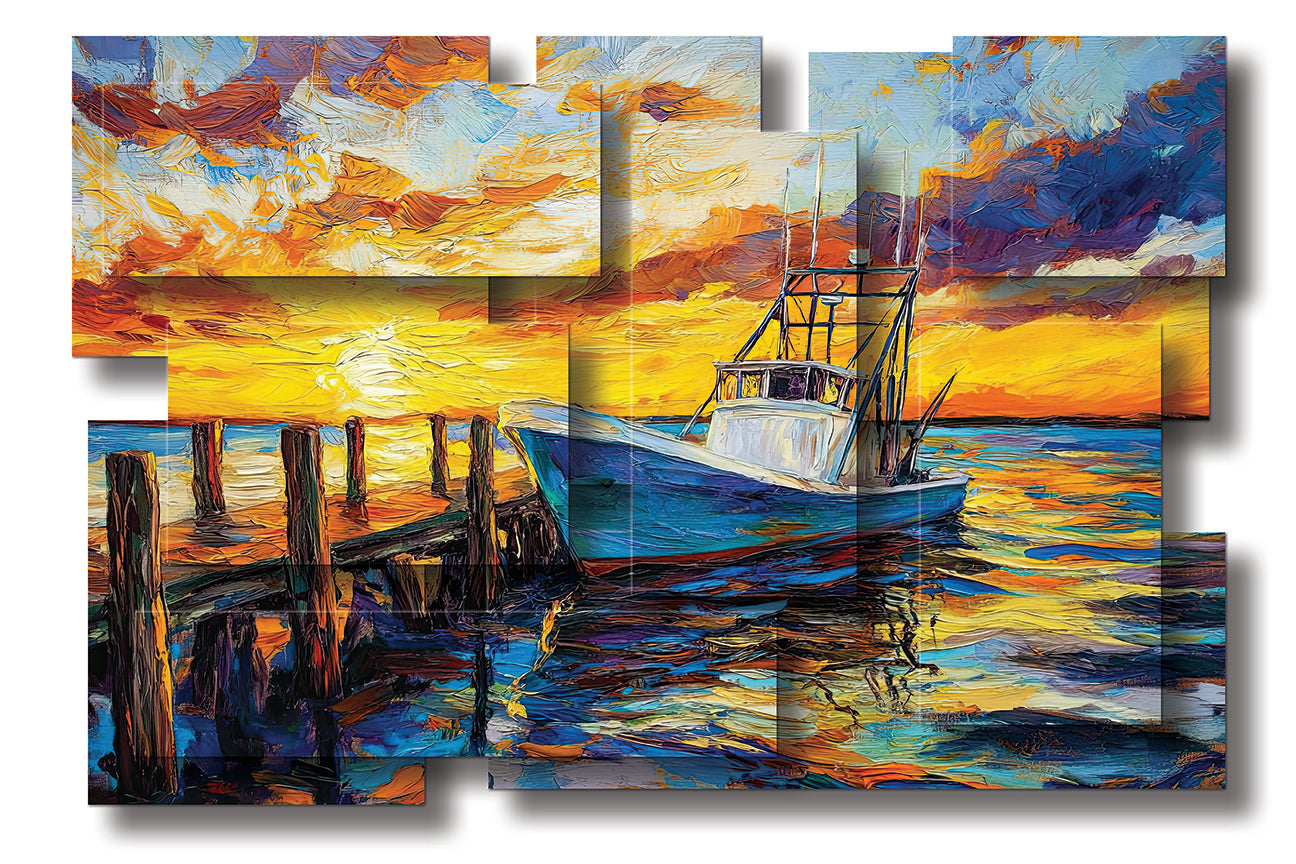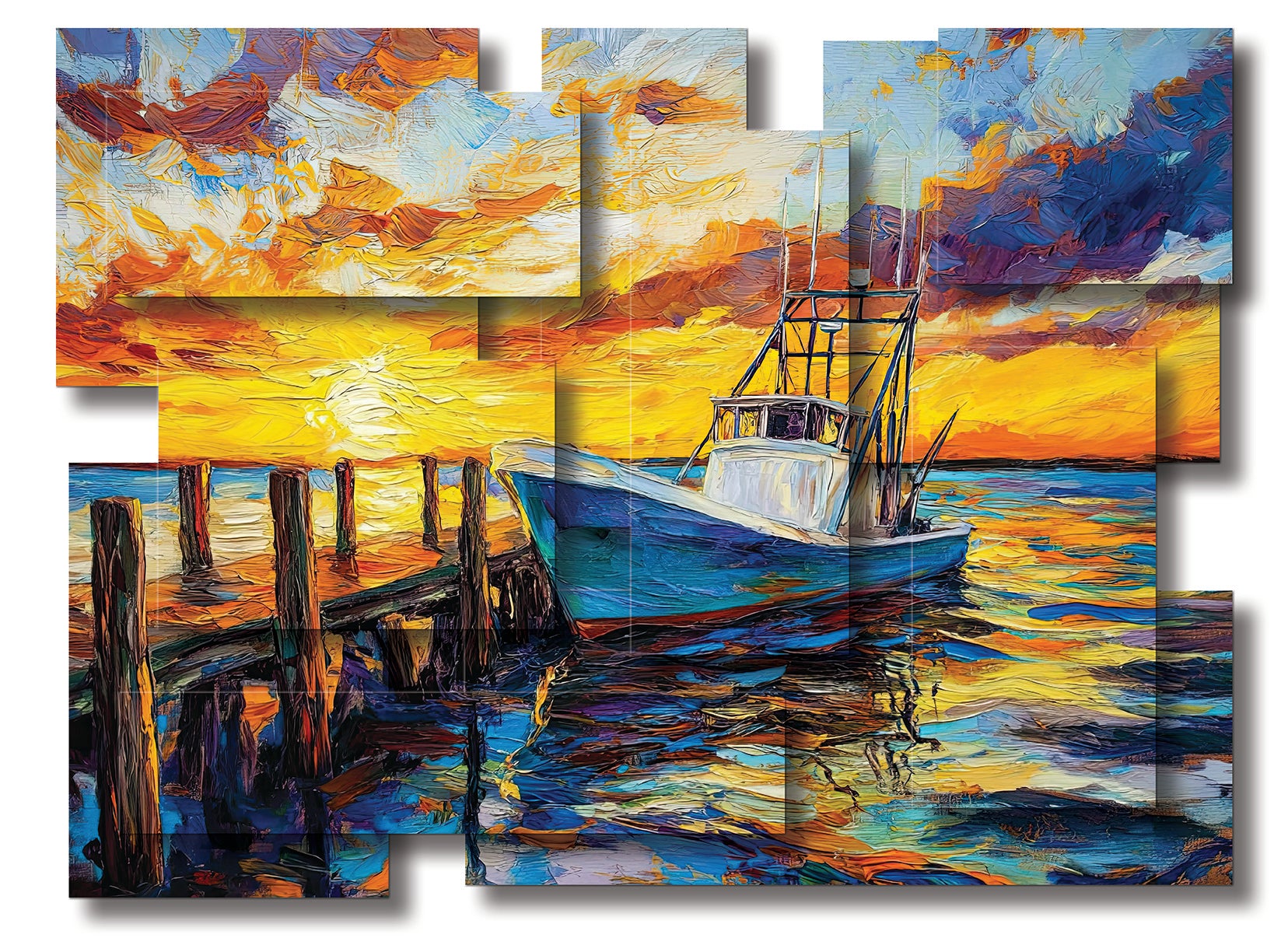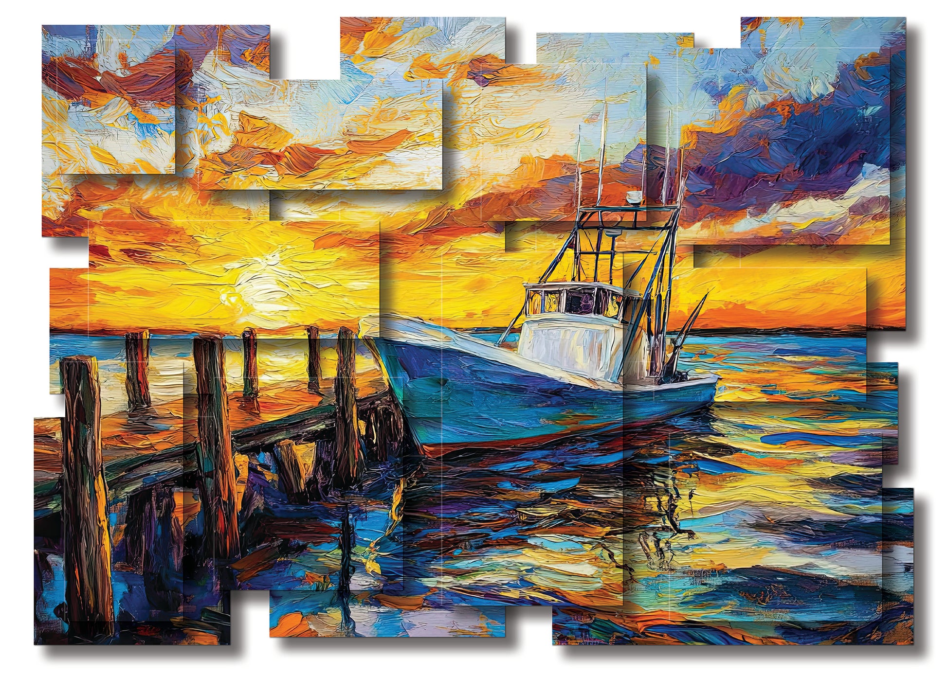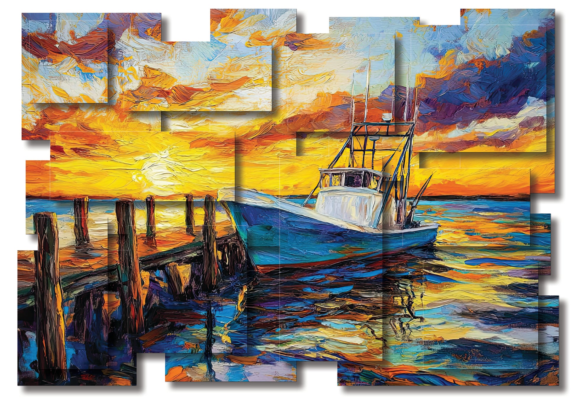 "This artwork radiates warmth and vibrancy, capturing a tranquil boat docked at sunset through bold, expressive strokes of color. The sky blazes with fiery oranges, golds, and hints of violet, its energy mirrored in the rippling water below. Thick impasto brushwork gives texture and depth, making the clouds and reflections almost tangible. The boat, painted in cooler tones of blue and white, provides a calm counterpoint to the intensity of the sunset, grounding the composition in quiet presence. Wooden pilings stretch into the water, guiding the viewer’s eye toward the glowing horizon where sky and sea dissolve into light. The piece embodies both motion and stillness, a celebration of nature’s brilliance and the timeless poetry of evening waters."