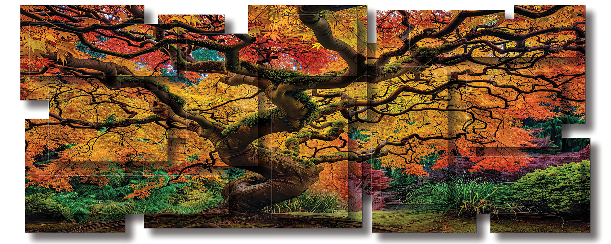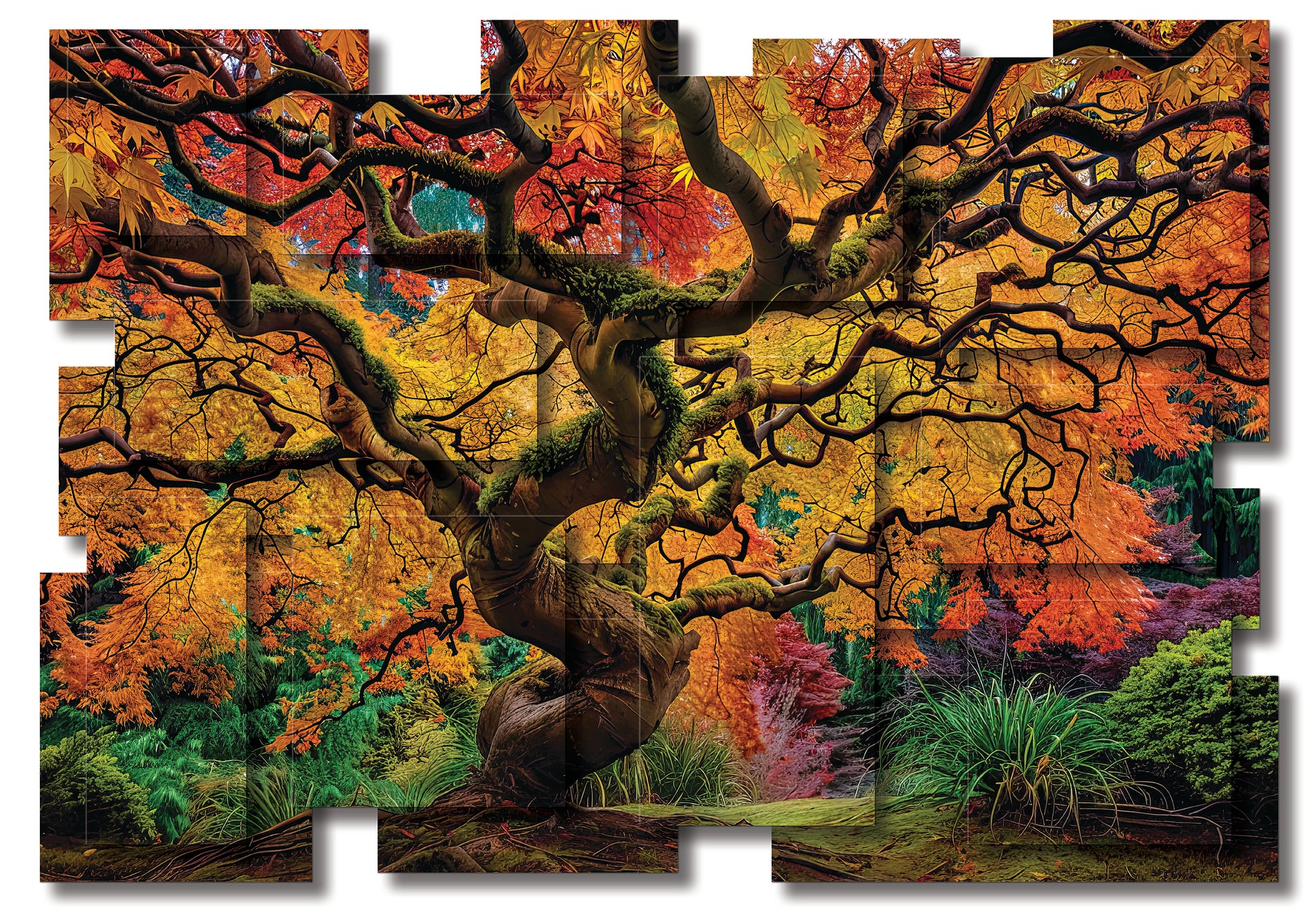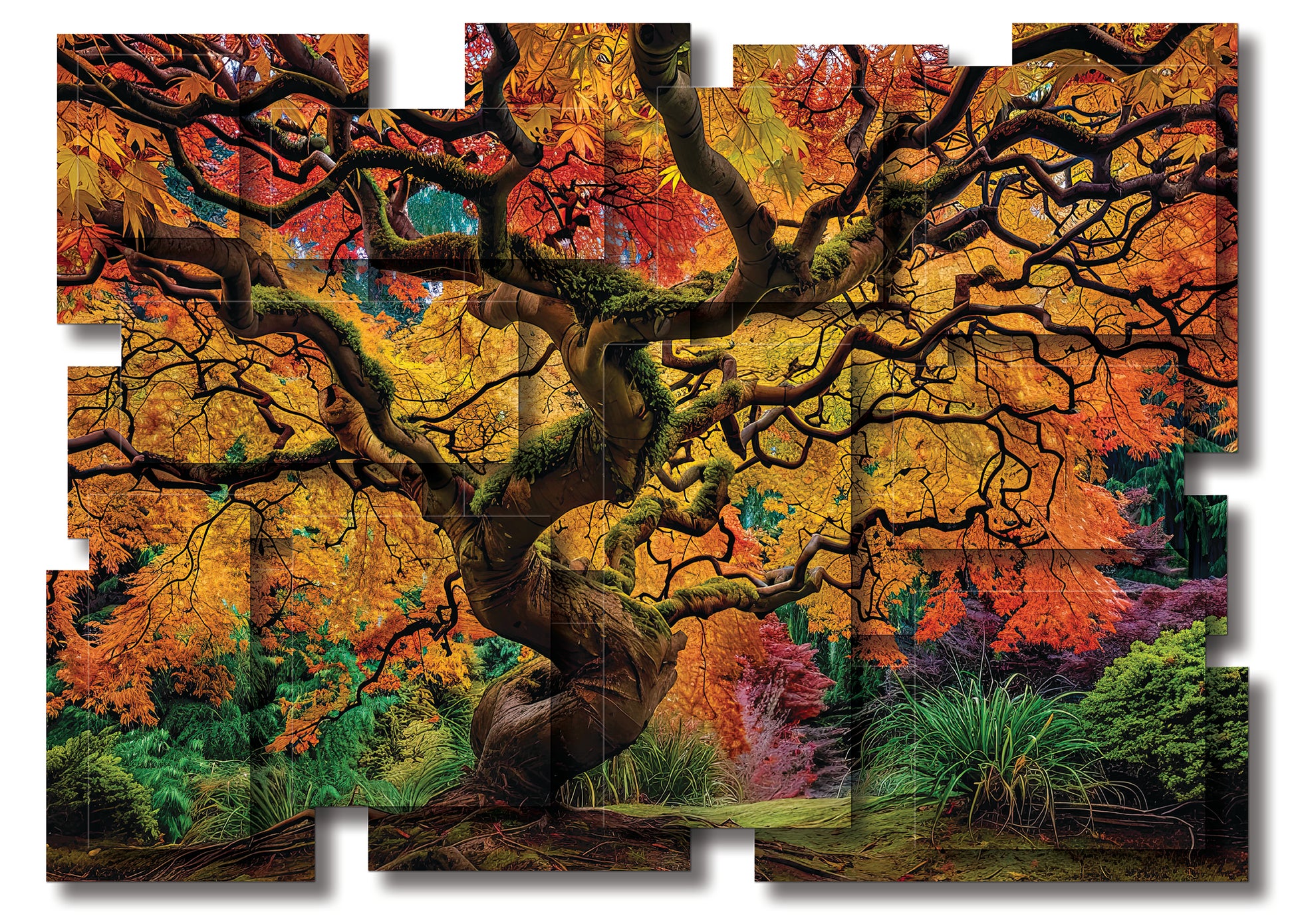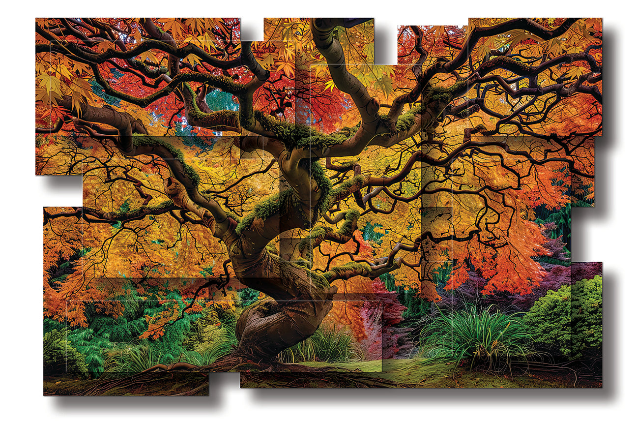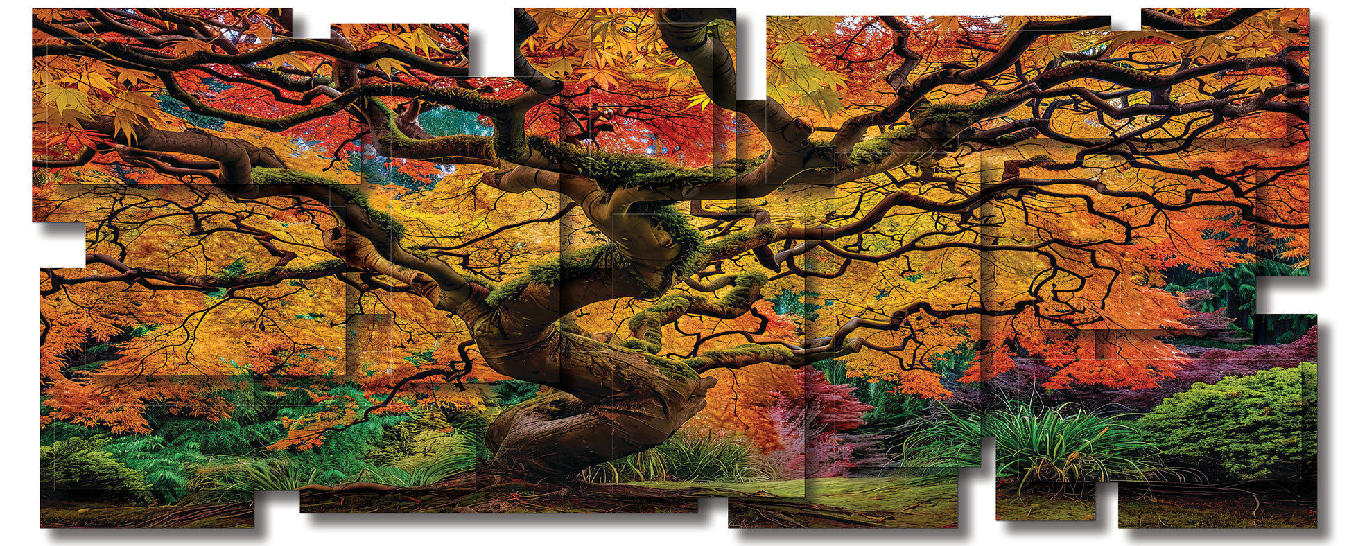 "This artwork portrays a mesmerizing Japanese maple tree in full autumn splendor, its twisting branches reaching outward like living brushstrokes across the canvas. The foliage burns with fiery reds, glowing oranges, and radiant yellows, each leaf a note in a symphony of color. Moss clings to the gnarled limbs, adding texture and grounding the tree within a lush, verdant garden. Light filters through the canopy, illuminating the leaves as if they themselves were aflame. The composition blends natural wonder with an almost dreamlike atmosphere, celebrating the elegance of form, the richness of color, and the fleeting brilliance of the season."