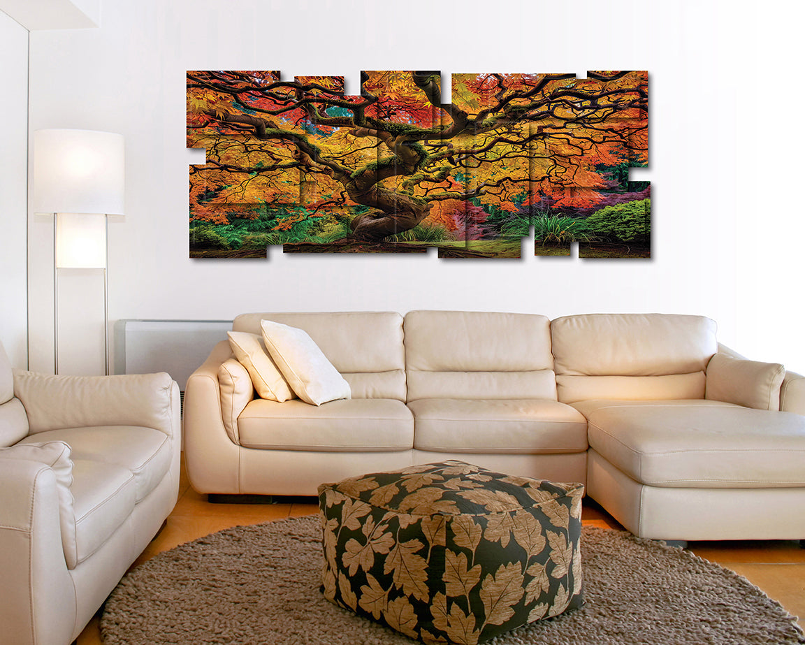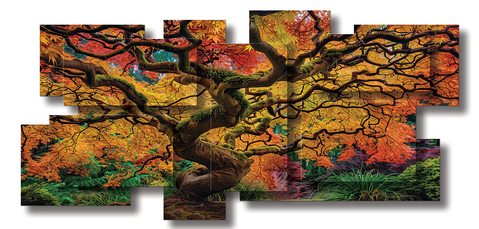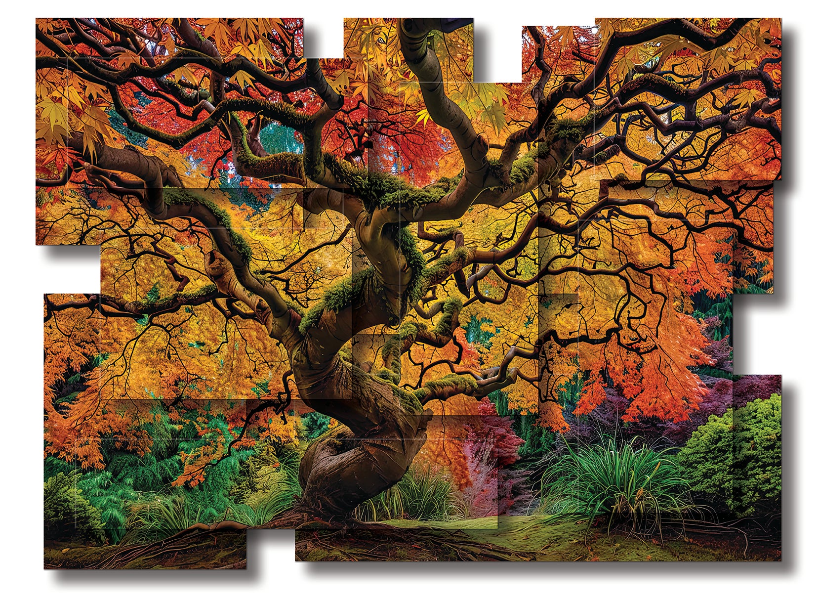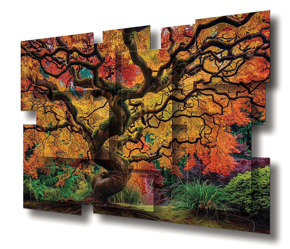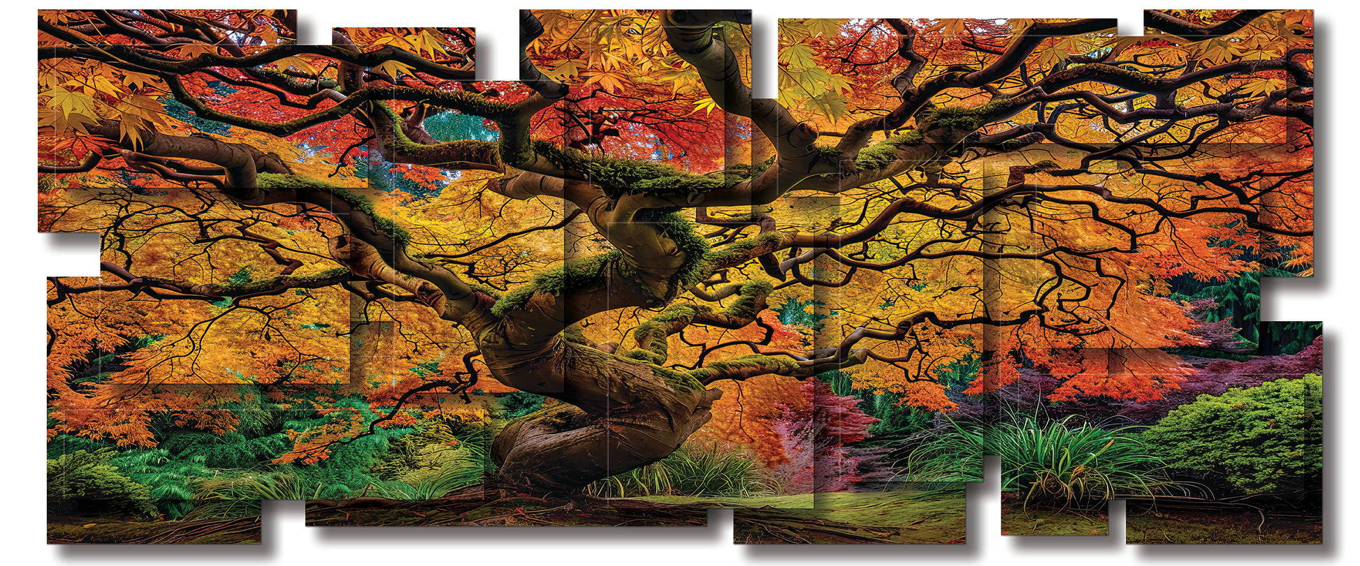 "This artwork portrays a mesmerizing Japanese maple tree in full autumn splendor, its twisting branches reaching outward like living brushstrokes across the canvas. The foliage burns with fiery reds, glowing oranges, and radiant yellows, each leaf a note in a symphony of color. Moss clings to the gnarled limbs, adding texture and grounding the tree within a lush, verdant garden. Light filters through the canopy, illuminating the leaves as if they themselves were aflame. The composition blends natural wonder with an almost dreamlike atmosphere, celebrating the elegance of form, the richness of color, and the fleeting brilliance of the season."