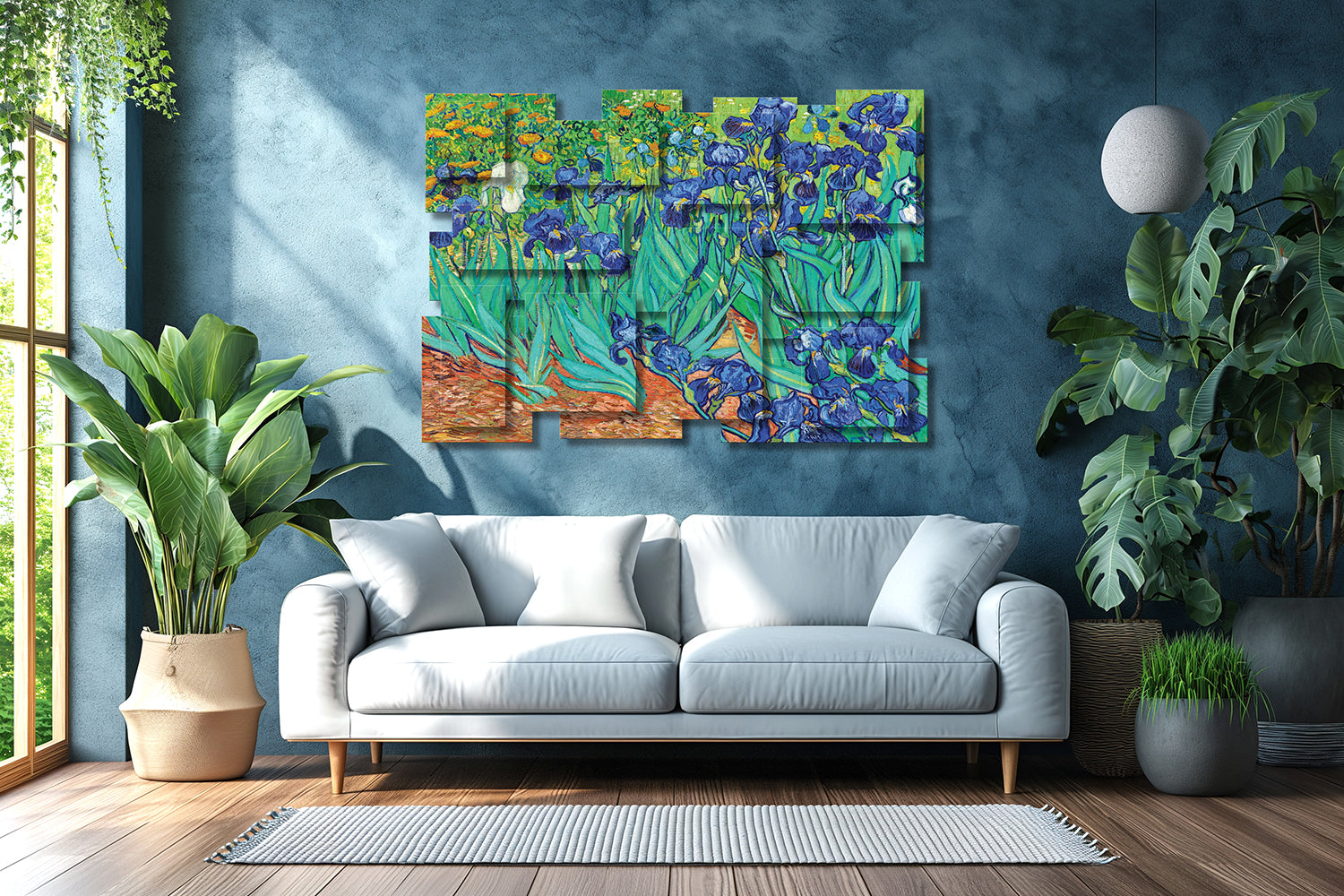 "This artwork originally painted by Van Gogh bursts with vitality and rhythm, capturing a garden alive with movement and color. The canvas is filled with lush green leaves and vibrant blue-violet blossoms, each rendered with Van Gogh’s expressive, swirling brushstrokes. The flowers bend and twist in varied directions, creating a sense of natural spontaneity, while the bold outlines and striking contrasts give them sculptural presence. A single white iris stands among the sea of blue, drawing the eye and suggesting individuality within harmony. The earthy tones of the soil balance the richness of the foliage, grounding the scene in a tactile reality. The piece radiates Van Gogh’s deep reverence for nature, transforming a simple cluster of blooms into a dynamic, almost spiritual meditation on life, growth, and diversity."