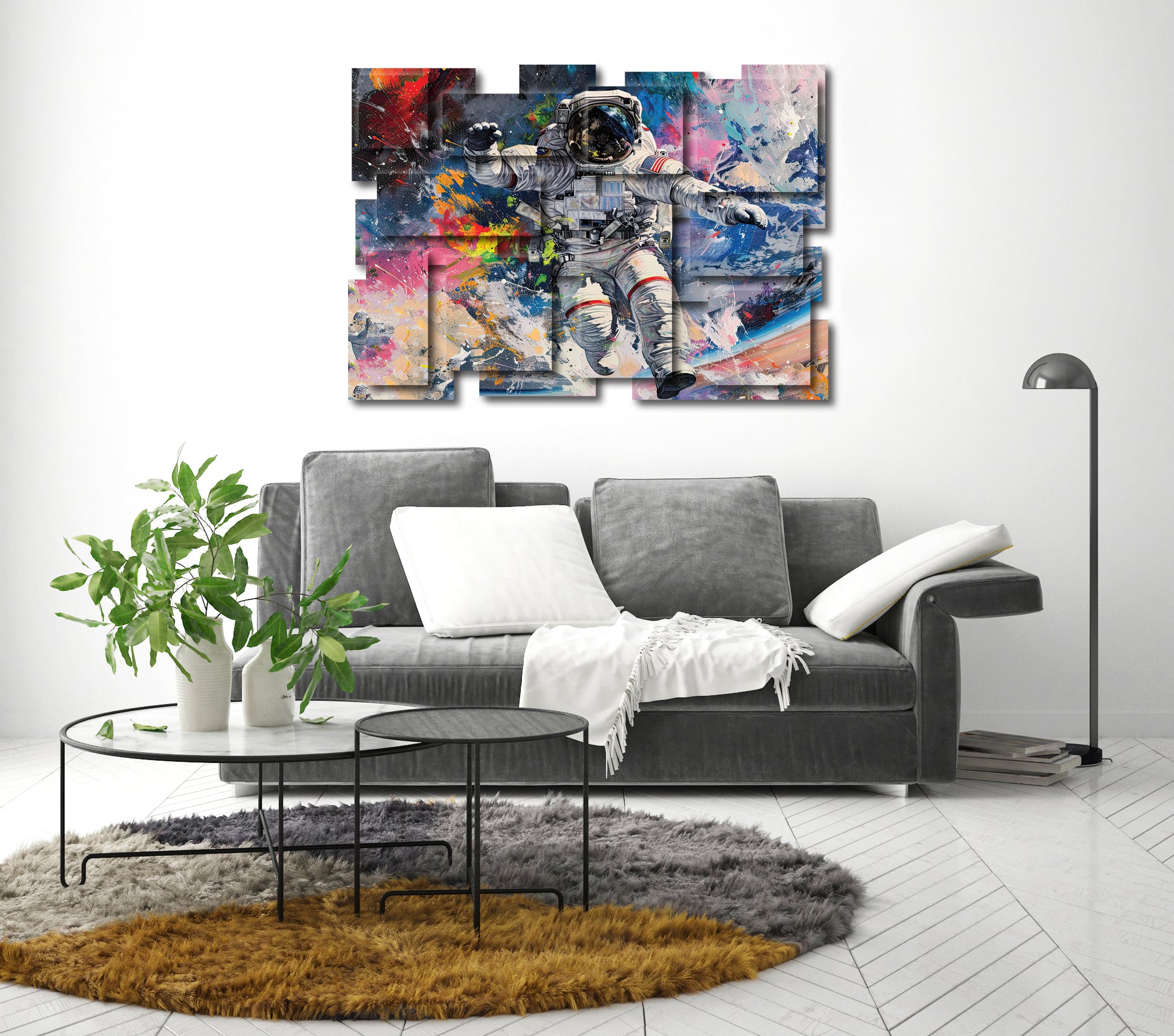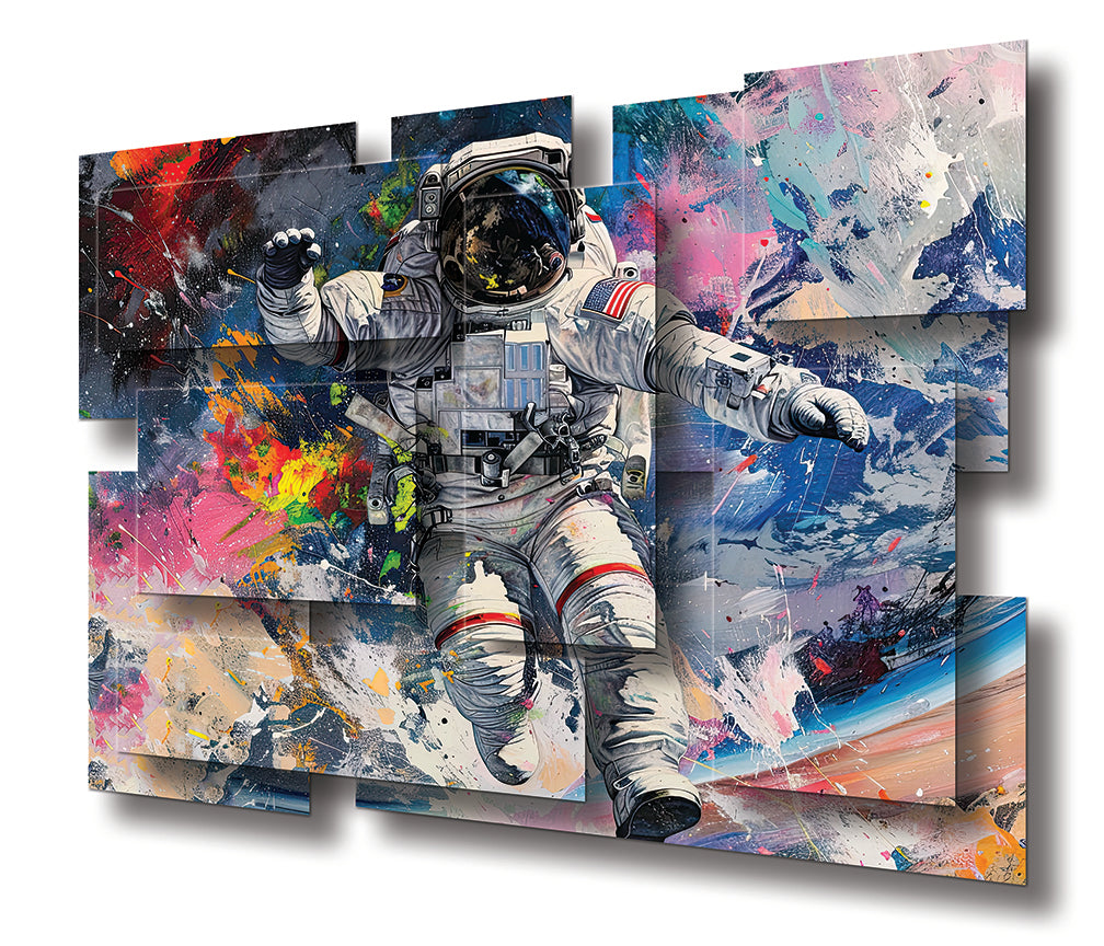 "This piece is an explosion of color and energy. A fusion of science and art: the astronaut represents exploration and technology, while the surrounding explosion of color symbolizes human creativity, dreamscapes, and the infinite possibilities of the universe. The use of expressive brushstrokes and splatters creates movement and intensity, suggesting that space is not silent emptiness but a canvas of creativity and emotion. Interstellar wonder and human imagination come together in this dynamic wall sculpture."
