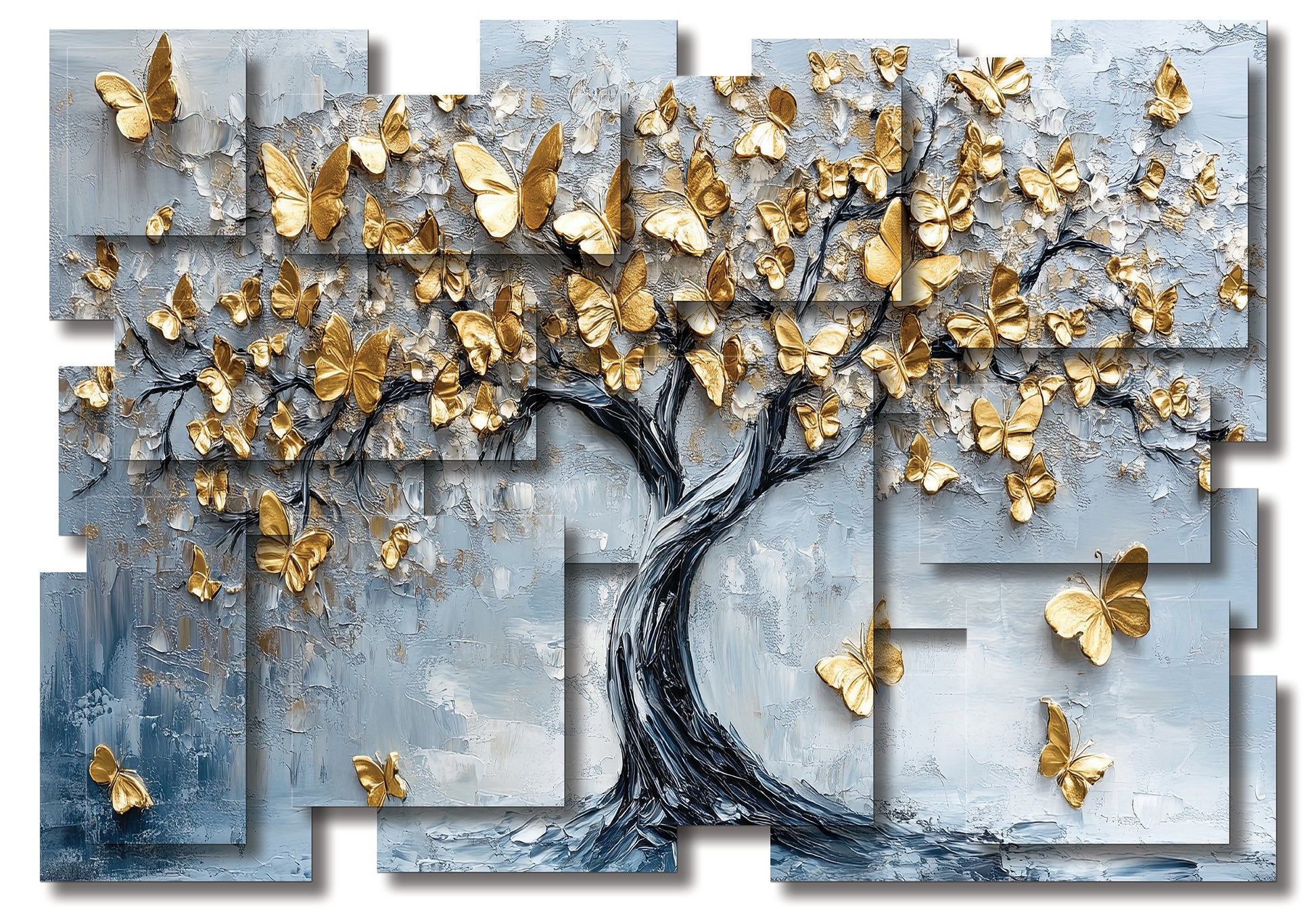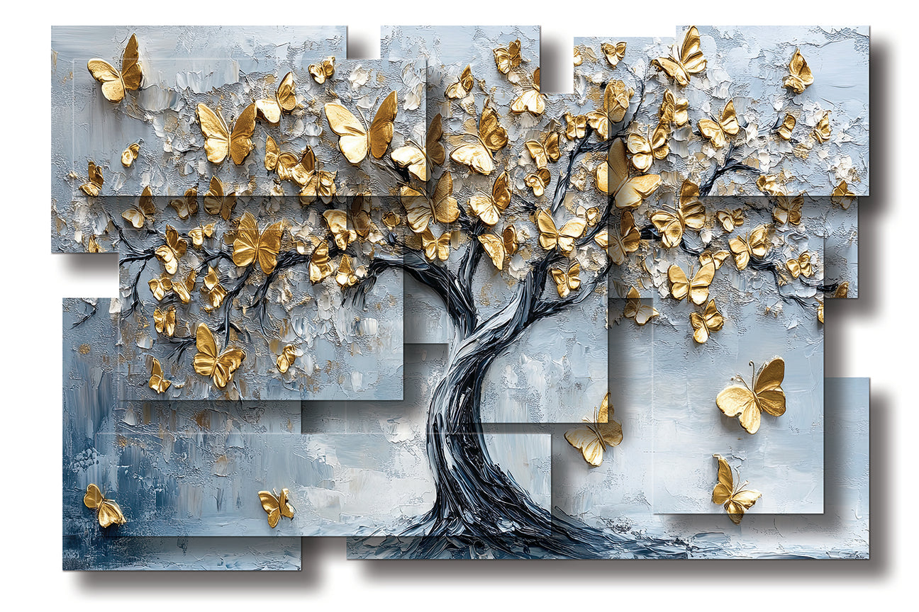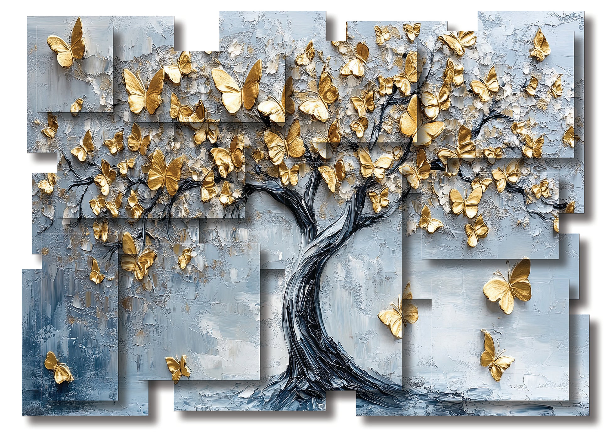 "This artwork depicts a dreamlike tree whose branches burst forth, not with leaves, but with luminous golden butterflies. Each butterfly glimmers against a muted background of soft grays and silvers, creating a striking contrast between opulence and serenity. The tree’s trunk twists upward with dynamic grace, grounding the composition while guiding the eye toward the fluttering forms. The butterflies appear in motion—some settled among the branches, others drifting into open space—suggesting transformation, freedom, and renewal. The piece fuses natural imagery with a sense of ethereal elegance, offering both visual richness and symbolic depth."