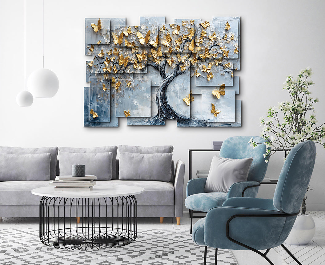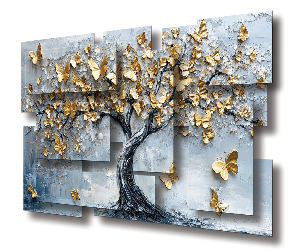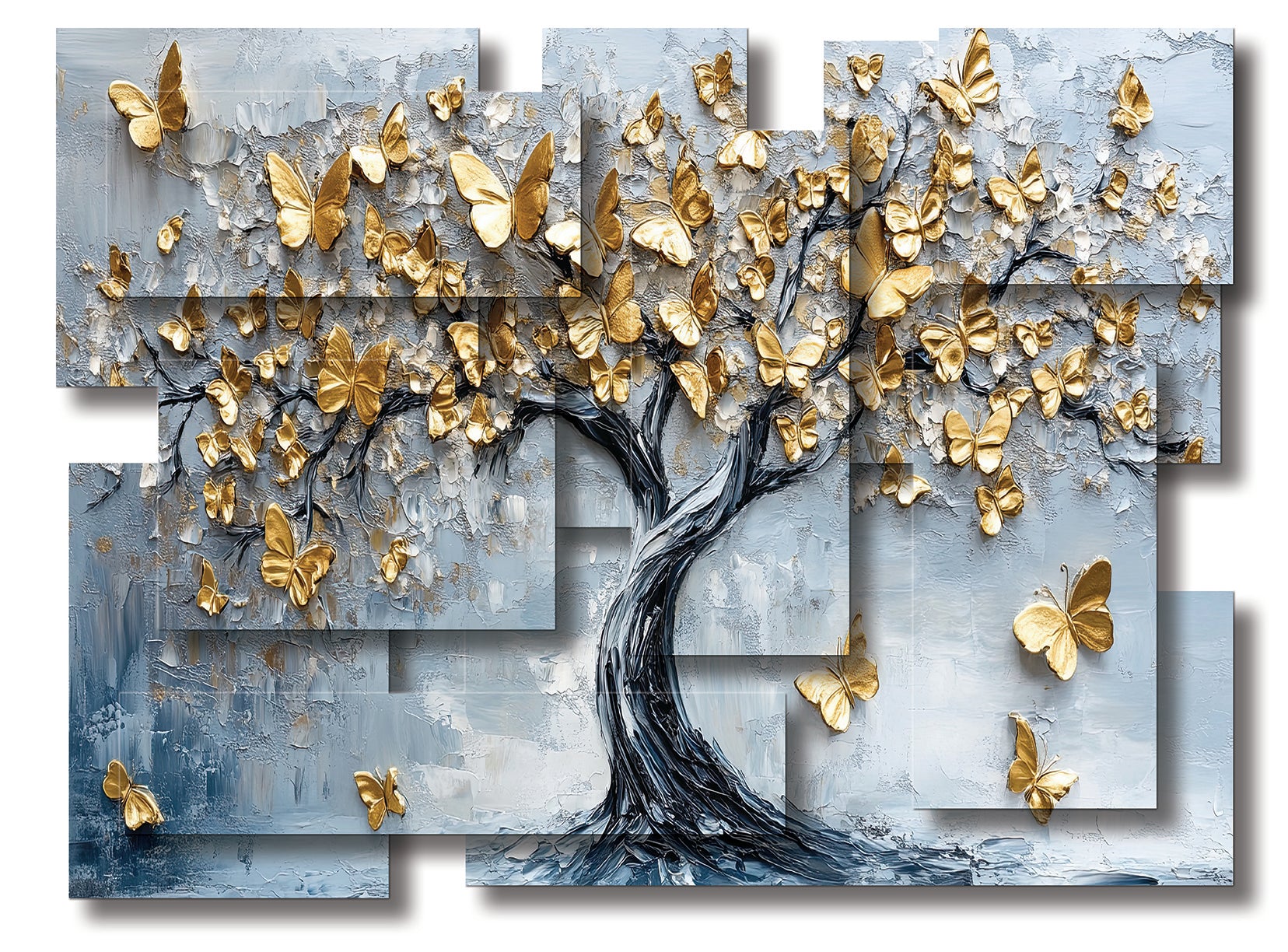 "This artwork depicts a dreamlike tree whose branches burst forth, not with leaves, but with luminous golden butterflies. Each butterfly glimmers against a muted background of soft grays and silvers, creating a striking contrast between opulence and serenity. The tree’s trunk twists upward with dynamic grace, grounding the composition while guiding the eye toward the fluttering forms. The butterflies appear in motion—some settled among the branches, others drifting into open space—suggesting transformation, freedom, and renewal. The piece fuses natural imagery with a sense of ethereal elegance, offering both visual richness and symbolic depth."