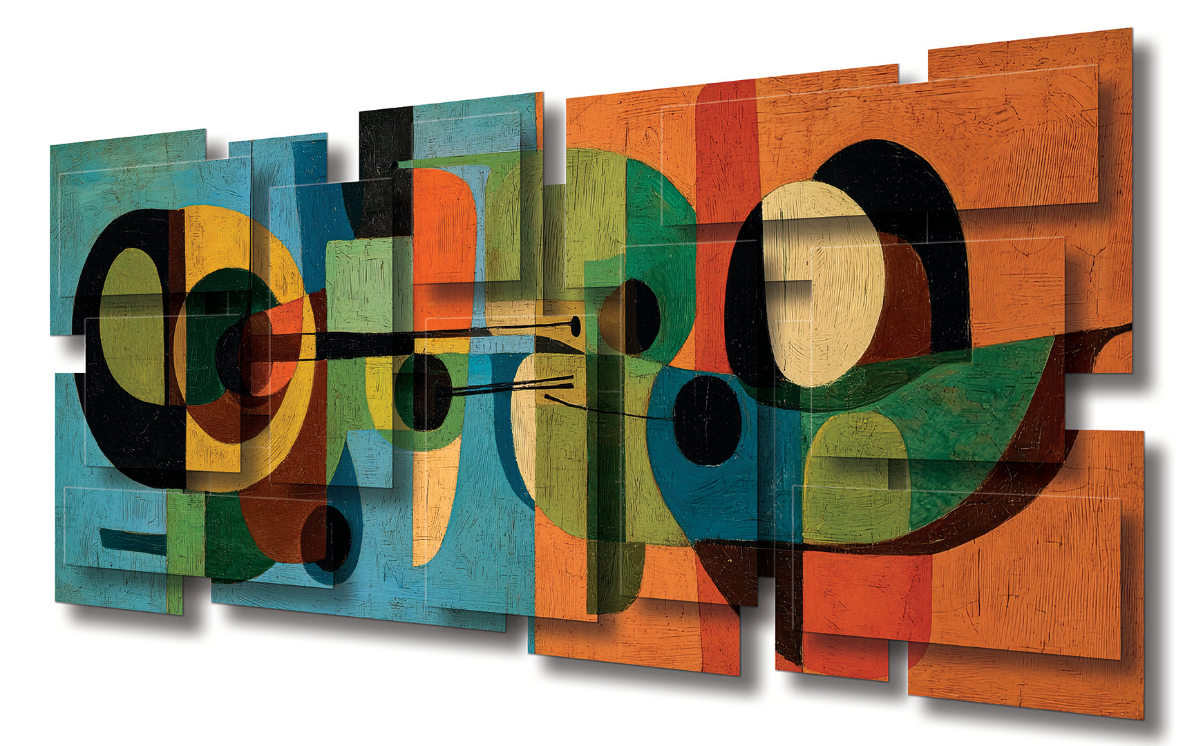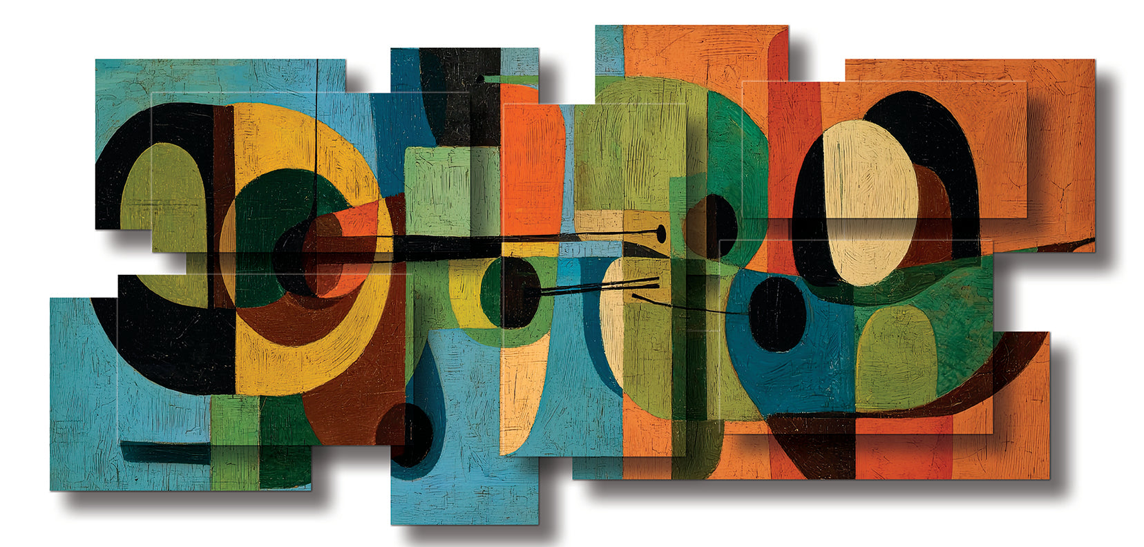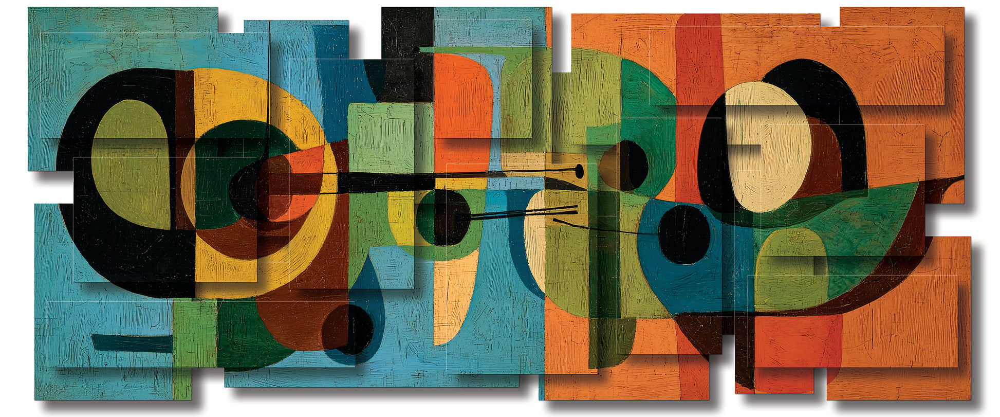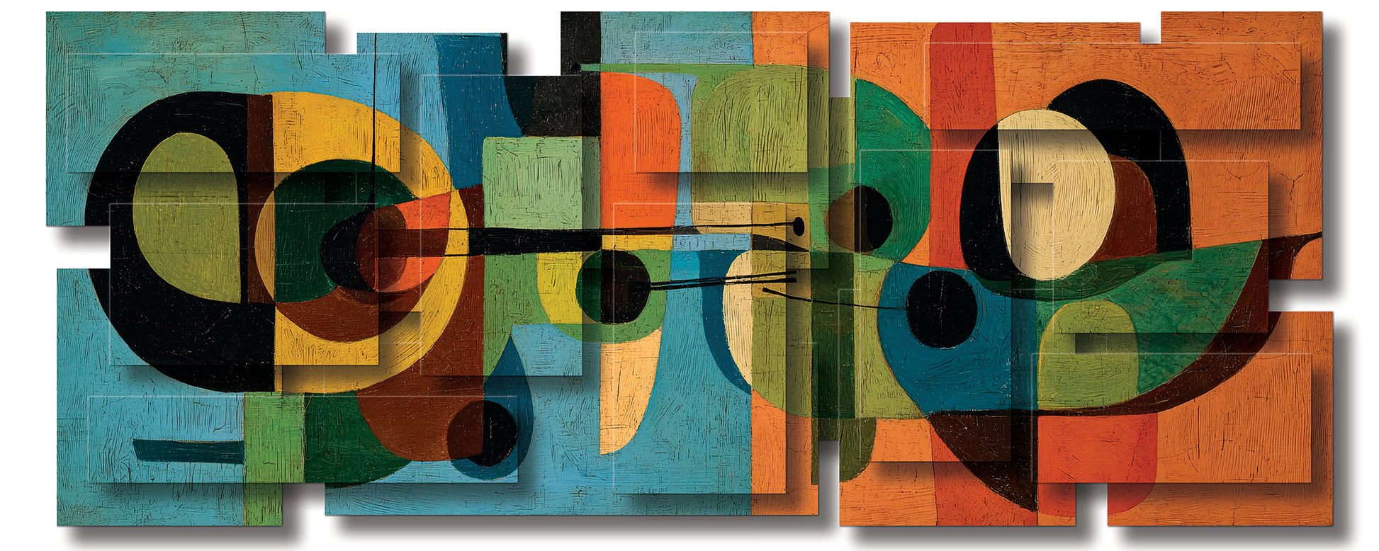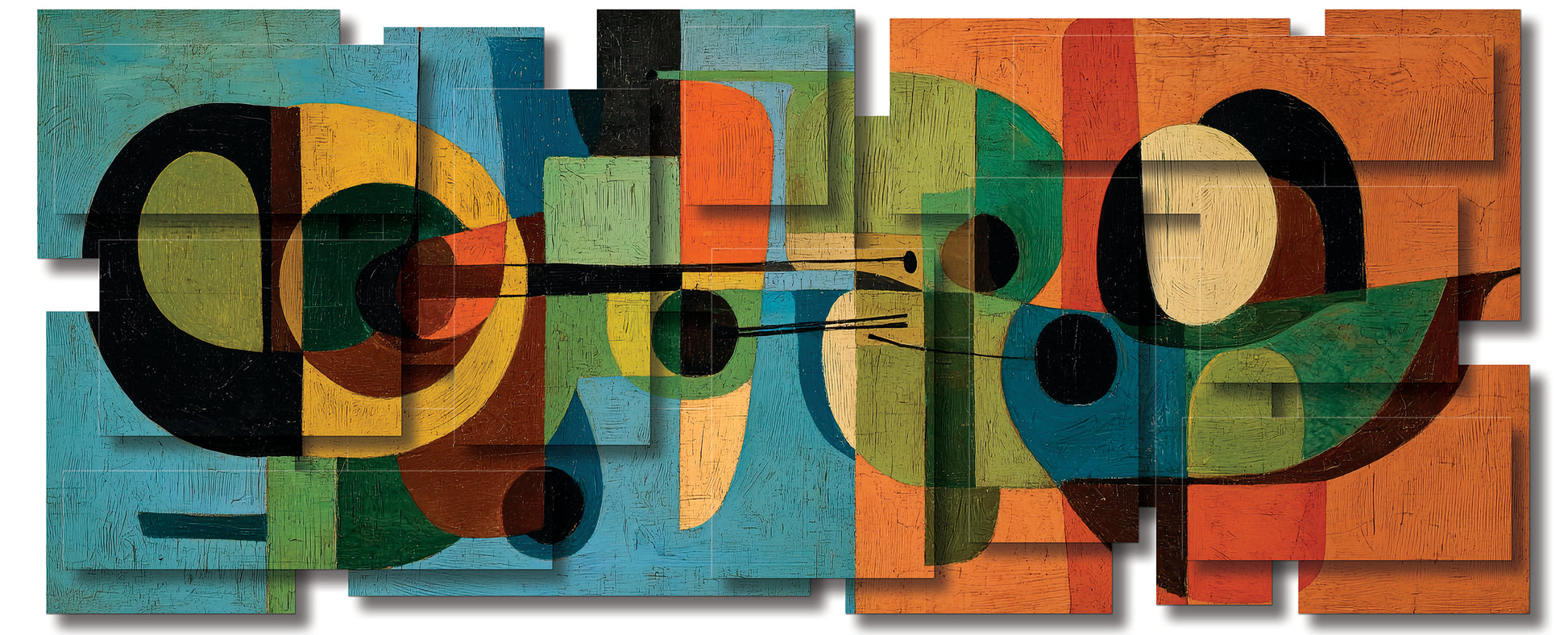 The palette rich in color evokes both warmth and sophistication, grounding the piece in the design sensibilities of the 1950s and 60s. The overlapping forms and layered transparencies suggest instruments, architecture, or perhaps abstracted figures, inviting the viewer to discover multiple interpretations within its visual rhythm.