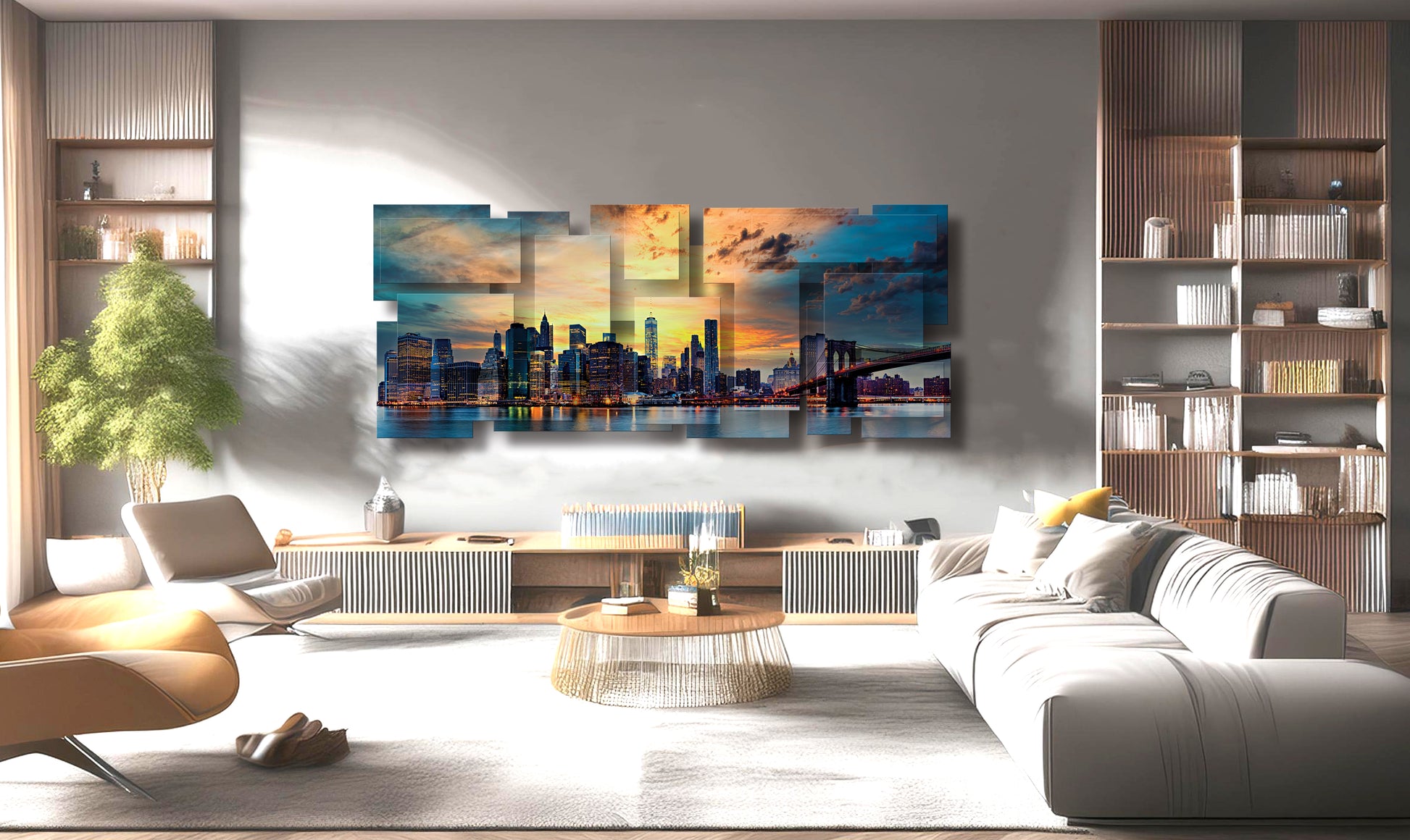 "This artwork captures the city as both a monument and a dreamscape, transforming architecture into a glowing symphony of light and color. The towering skyscrapers rise like luminous pillars against a richly painted sunset sky, where streaks of orange, gold, and deep blue melt into one another. Reflections ripple across the Hudson River, turning the water into a liquid canvas of shifting jewel tones.
