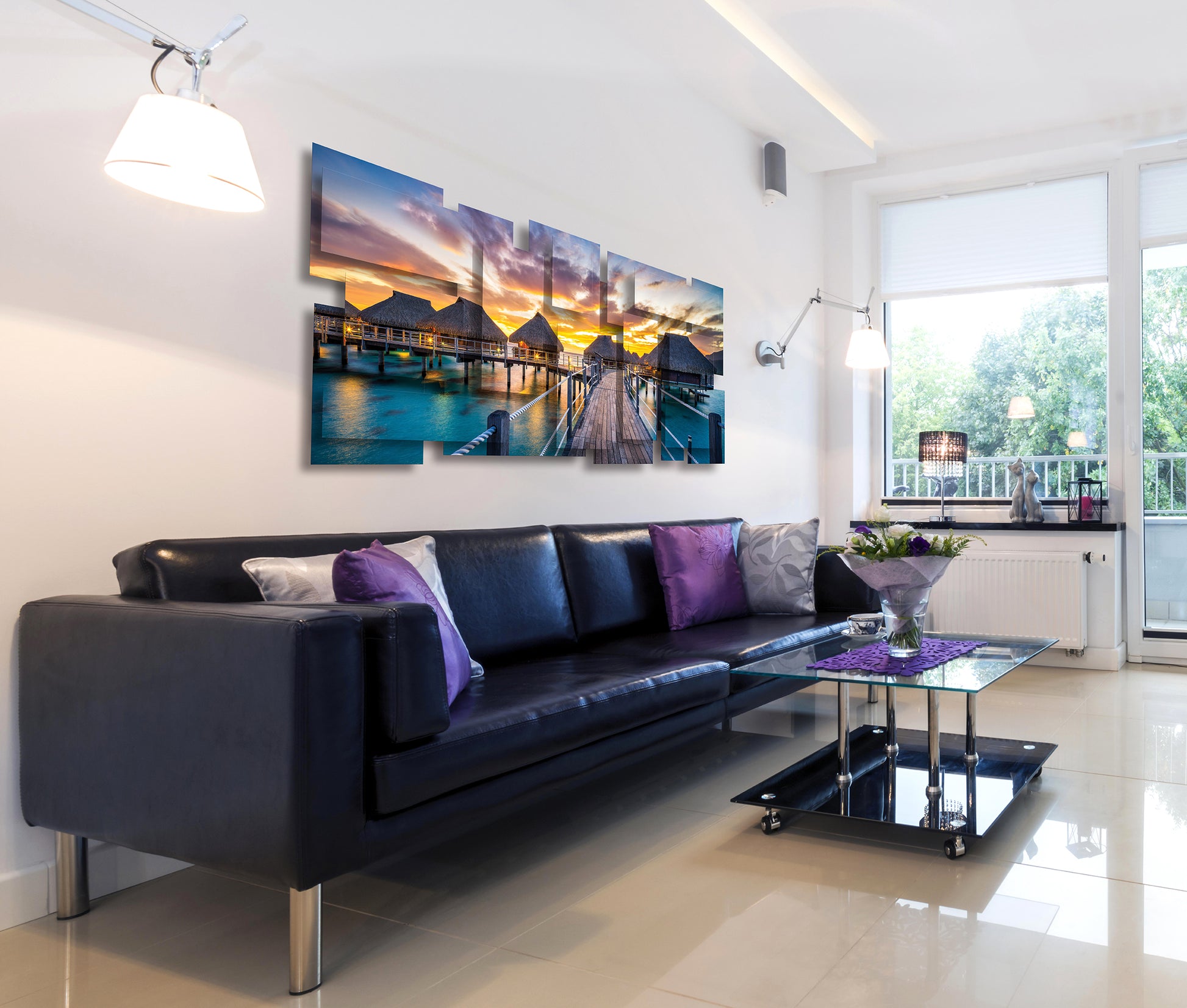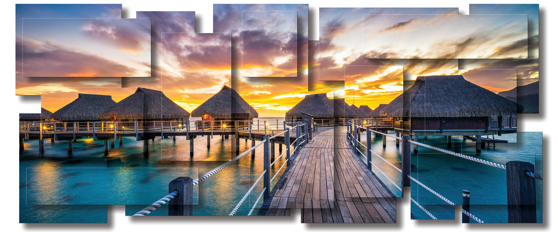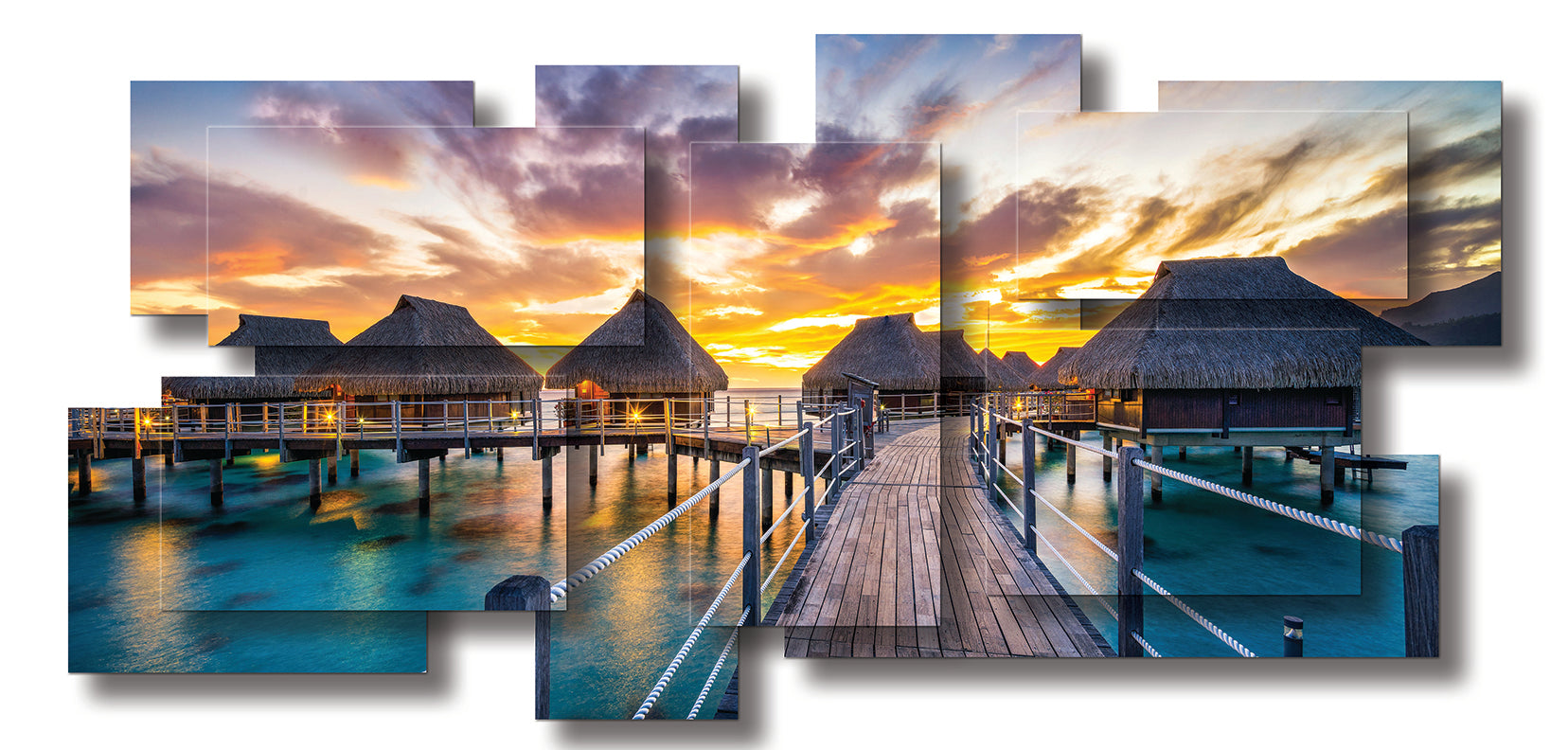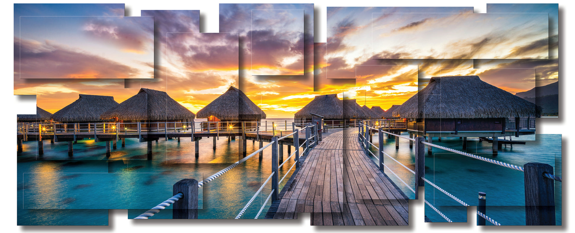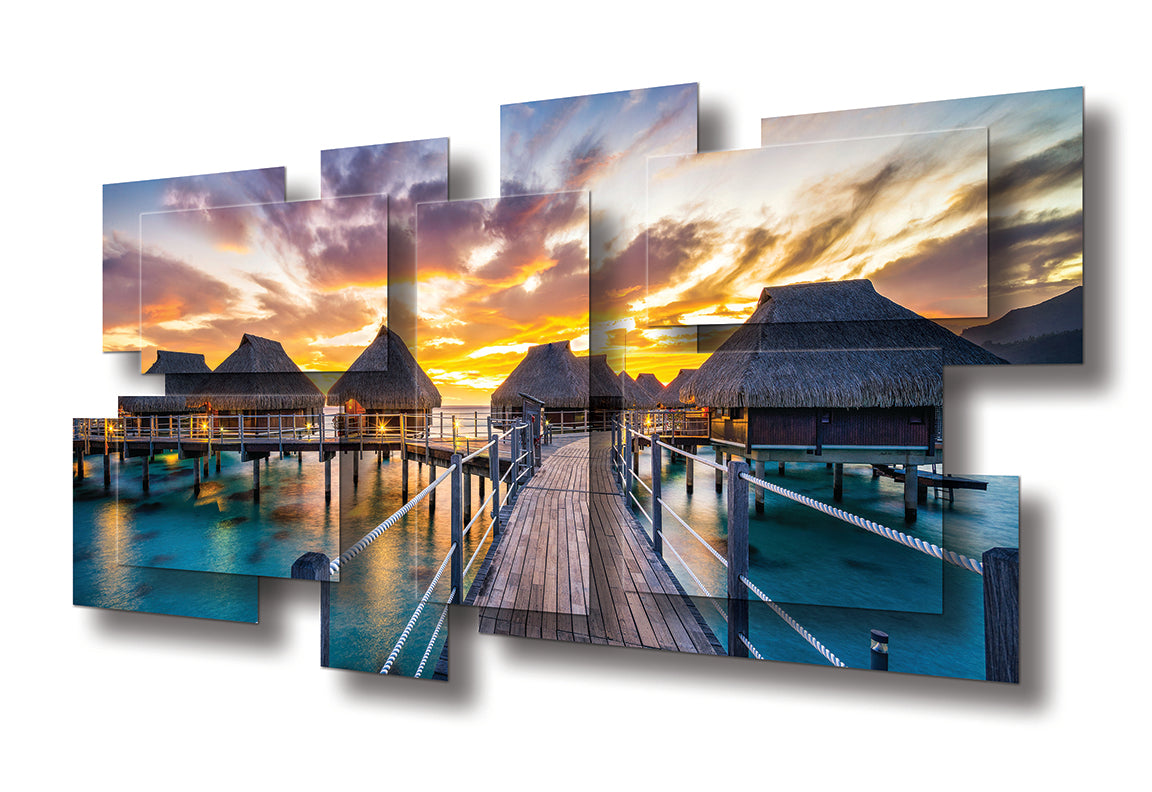 "This artwork captures a vision of tropical serenity, where thatched-roof bungalows rise gracefully above turquoise waters. A wooden pathway, glowing warmly in the fading light, guides the eye toward the horizon where the sky erupts in a blaze of gold, orange, and violet. Reflections shimmer on the surface below, merging sea and sky into a seamless dance of color. The composition evokes both intimacy and expansiveness—a sanctuary suspended between earth and ocean, stillness and infinity. It is a portrait of paradise, inviting the viewer into a moment of timeless escape."