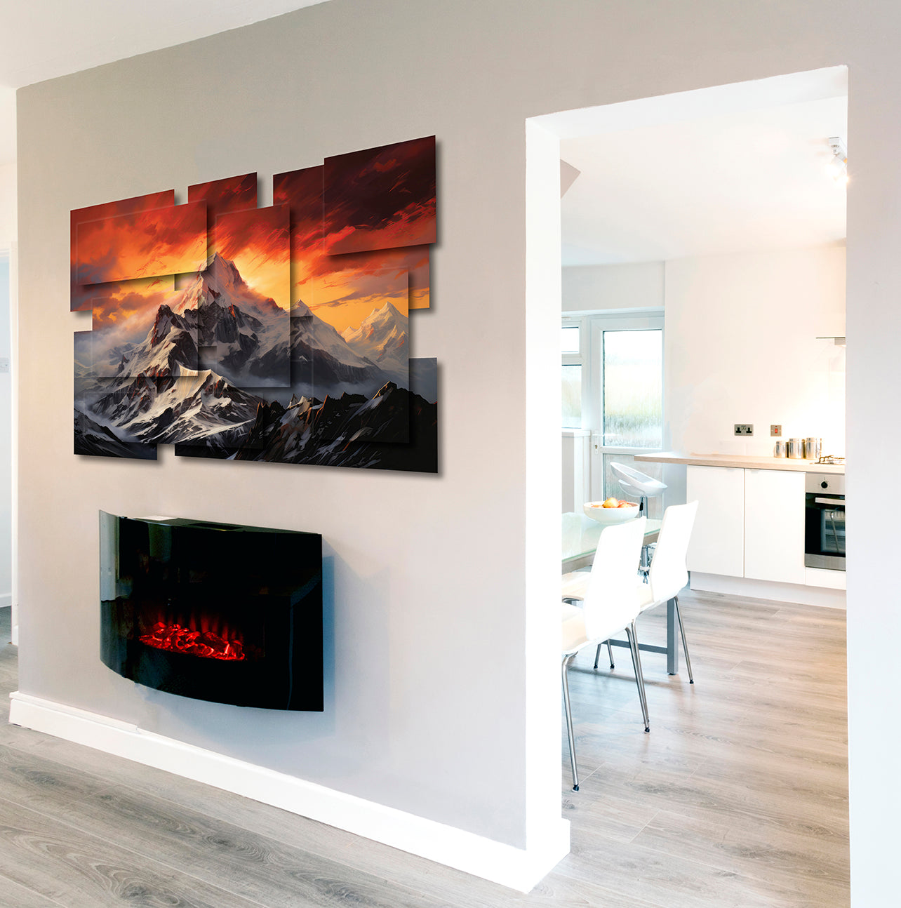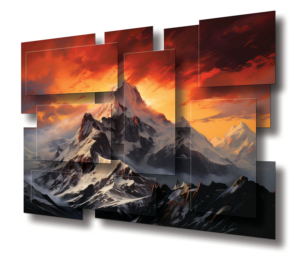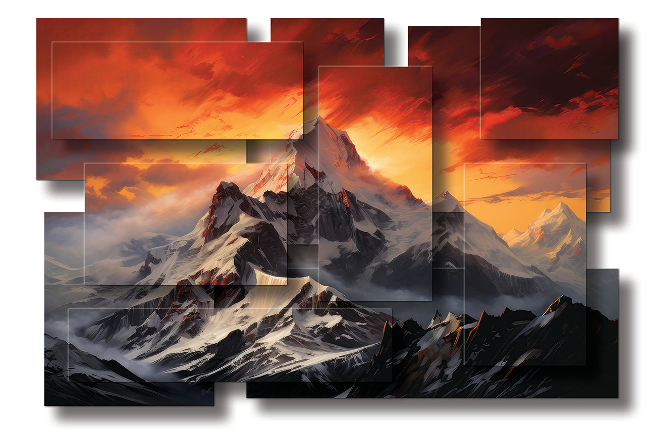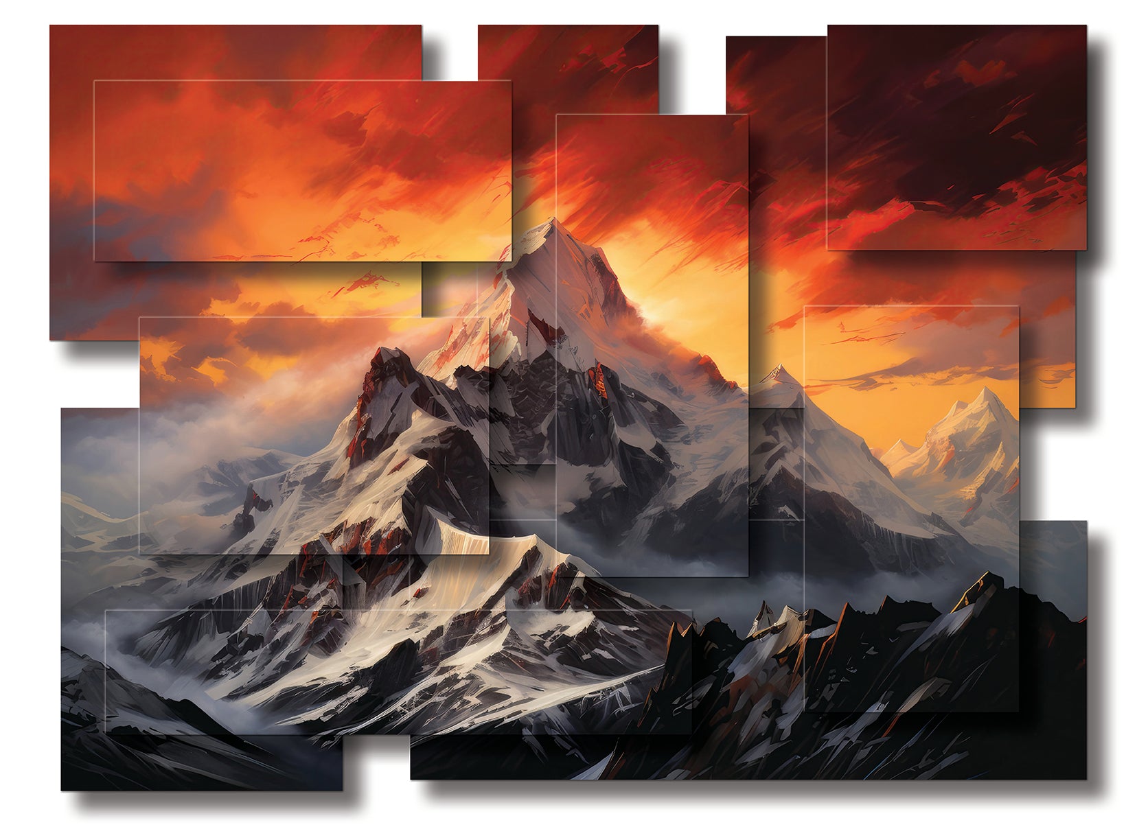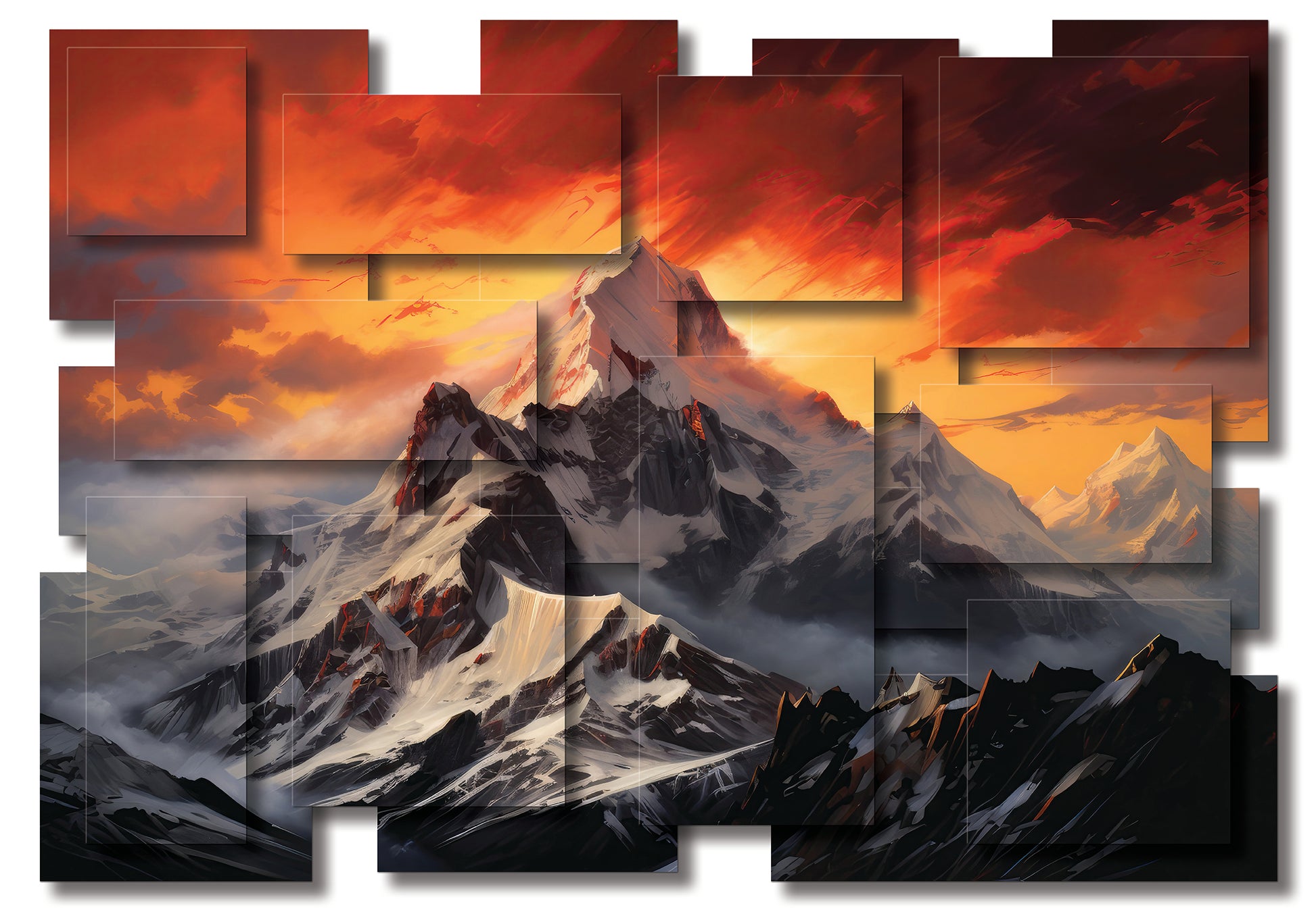 "A towering snow-capped mountain bathed in the fiery glow of a dramatic sky. The peak rises majestically through sweeping mists, its ridges and slopes sculpted with sharp contrasts of light and shadow. Warm hues of orange, red, and gold cascade across the heavens, igniting the clouds with an almost celestial intensity, while cooler grays and whites cloak the rugged terrain below. The interplay of fire and ice, sky and stone, conveys both the sublime beauty and the formidable power of nature. The composition evokes awe and reverence, presenting the mountain as a timeless monument—an emblem of endurance, mystery, and transcendence."