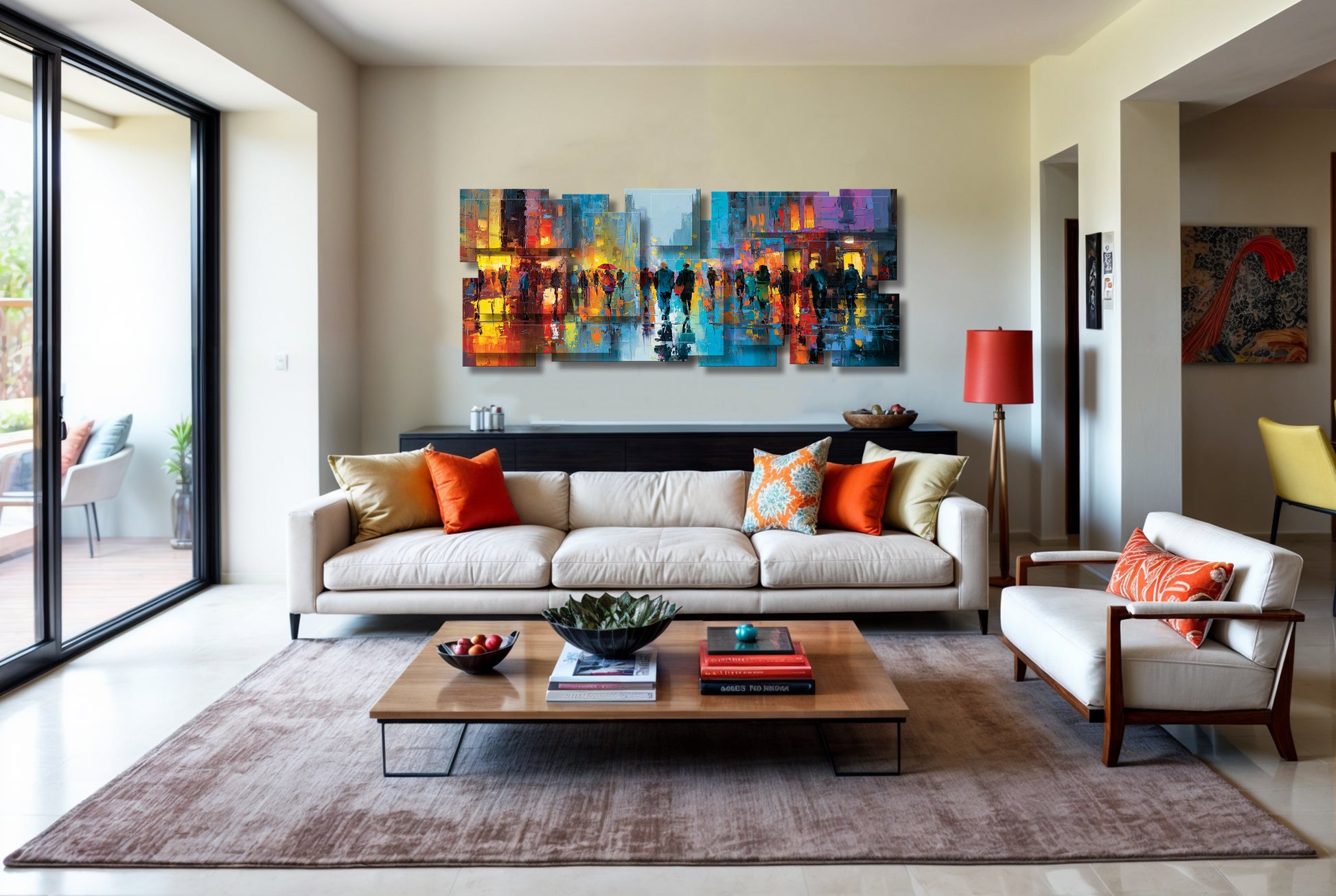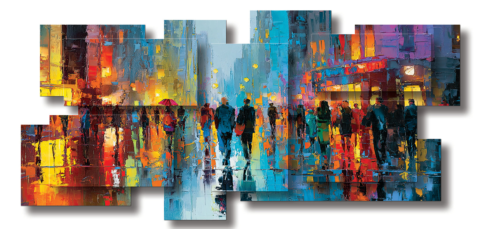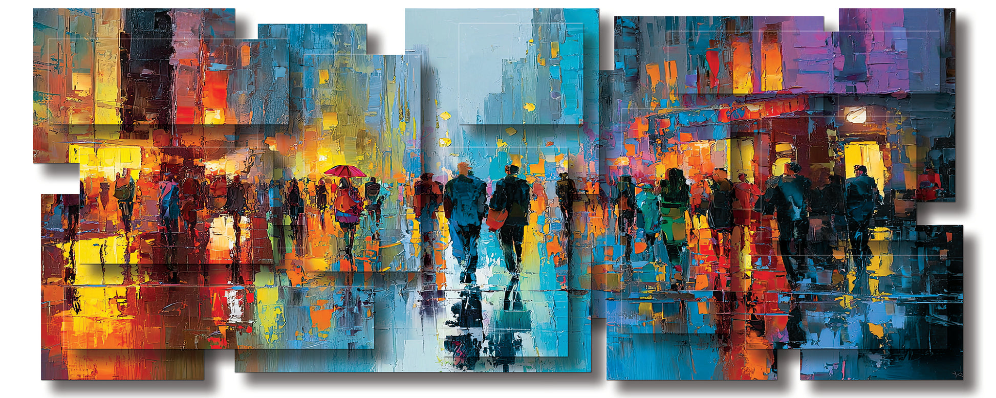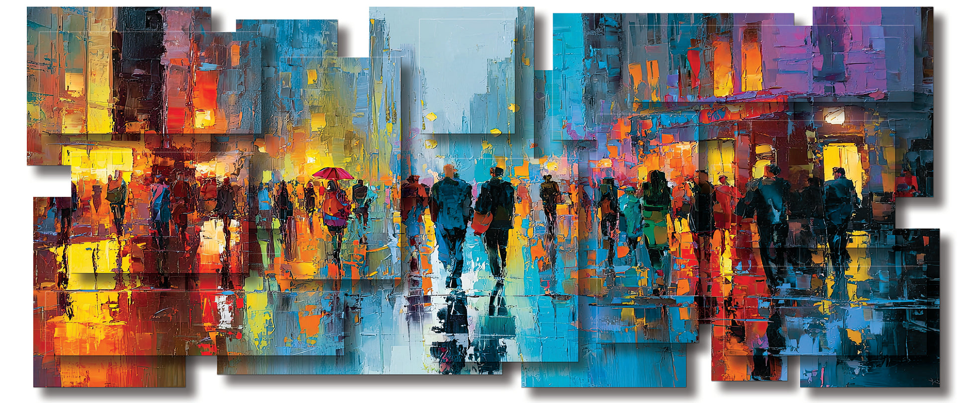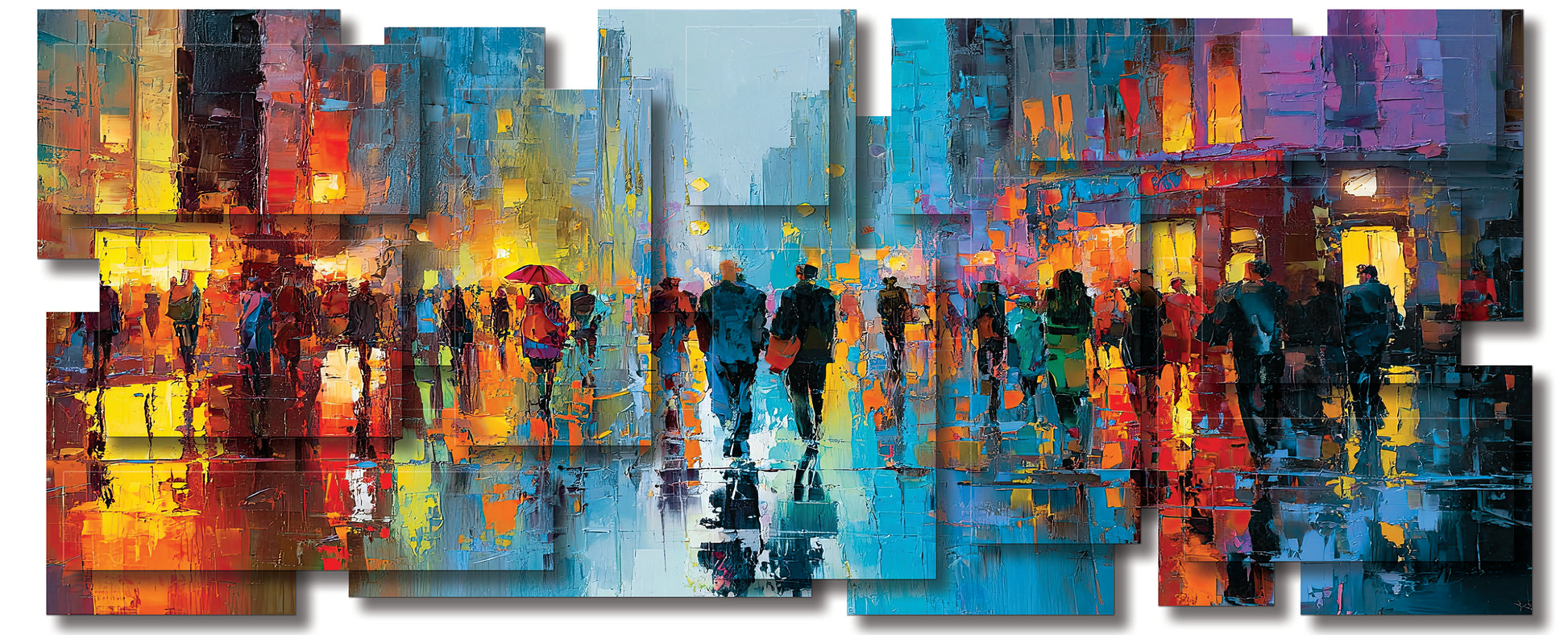 "Pulse captures the heartbeat of the modern city through bold, impressionistic strokes and a symphony of luminous color. Figures move through rain-slicked streets beneath towering buildings that glow with vibrant yellows, blues, reds, and violets, their reflections shimmering across the wet pavement like living fragments of light. Pulse is less about literal depiction and more about sensation—capturing the vibrancy, chaos, and beauty of humanity woven together in the luminous fabric of the city night."