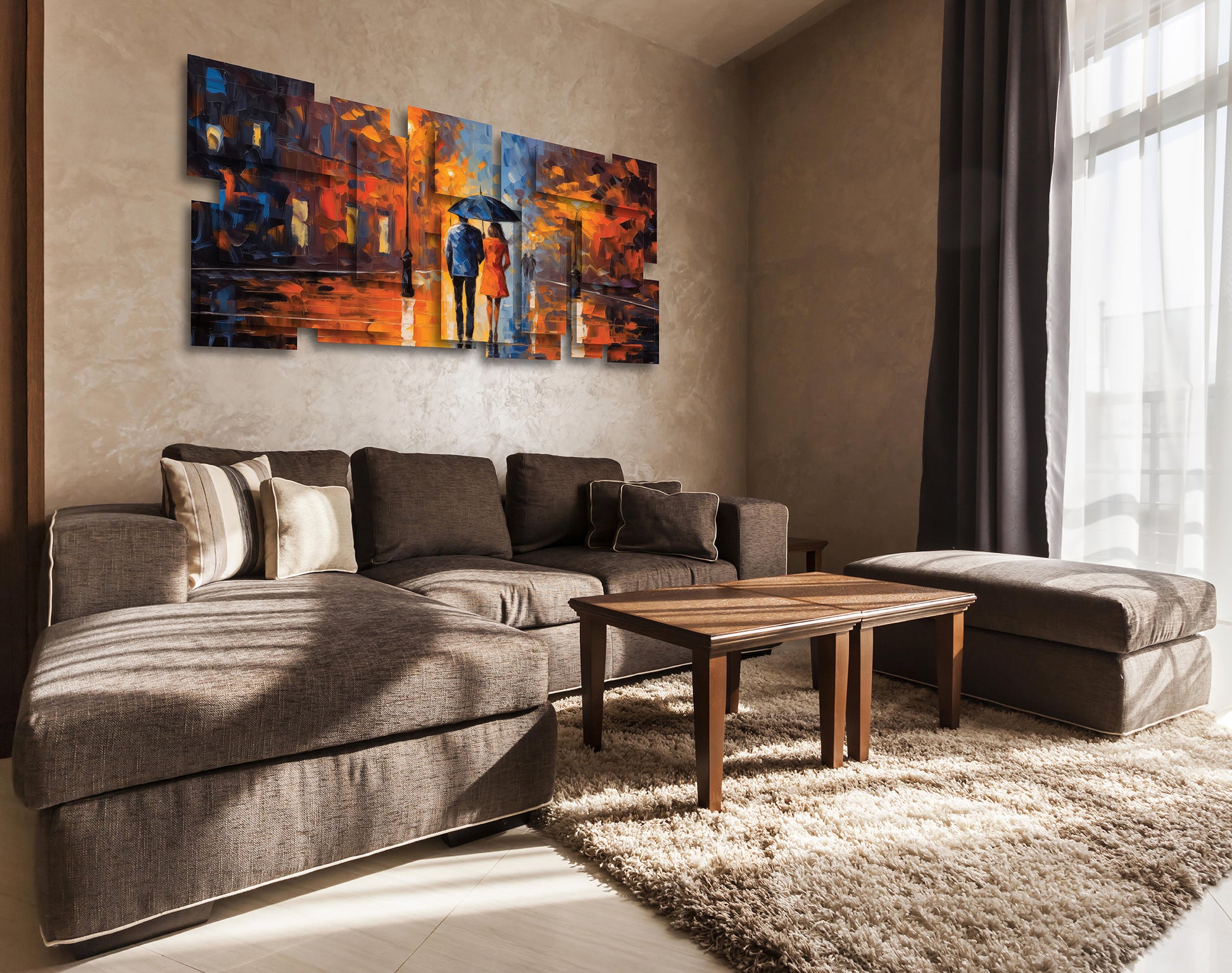 "A romantic evening scene as the glowing lamplights scatter warm yellows and fiery oranges across the rain-slicked street, their reflections shimmering like liquid flame. In contrast, cool blues and purples weave through the composition, balancing the vibrancy with a quiet sense of calm. The blurred silhouettes in the background evoke movement and mystery, while the central couple becomes a symbol of intimacy and companionship. The art conveys the beauty of ordinary moments—love and connection illuminated against the fleeting, rain-washed glow of the city."