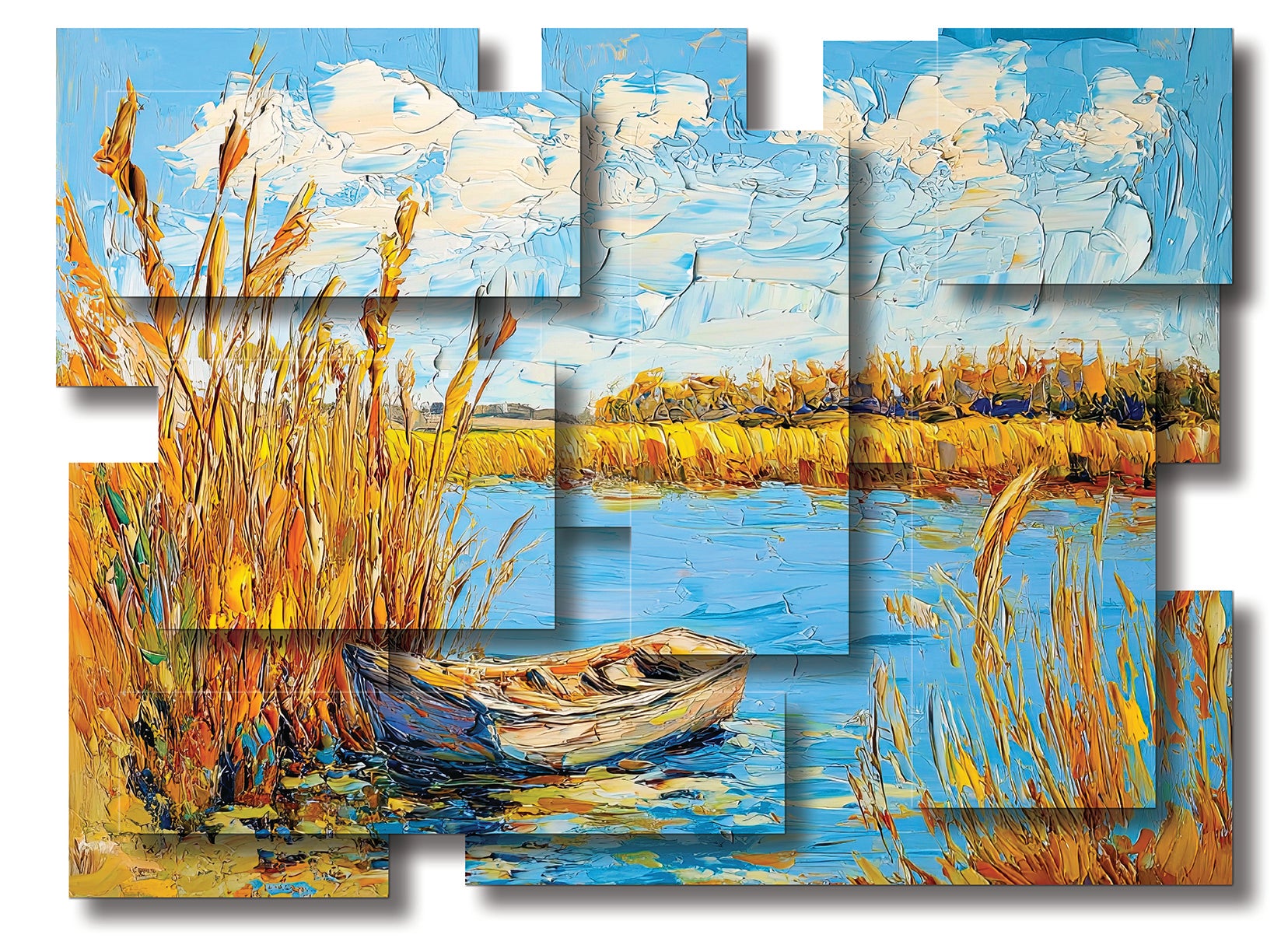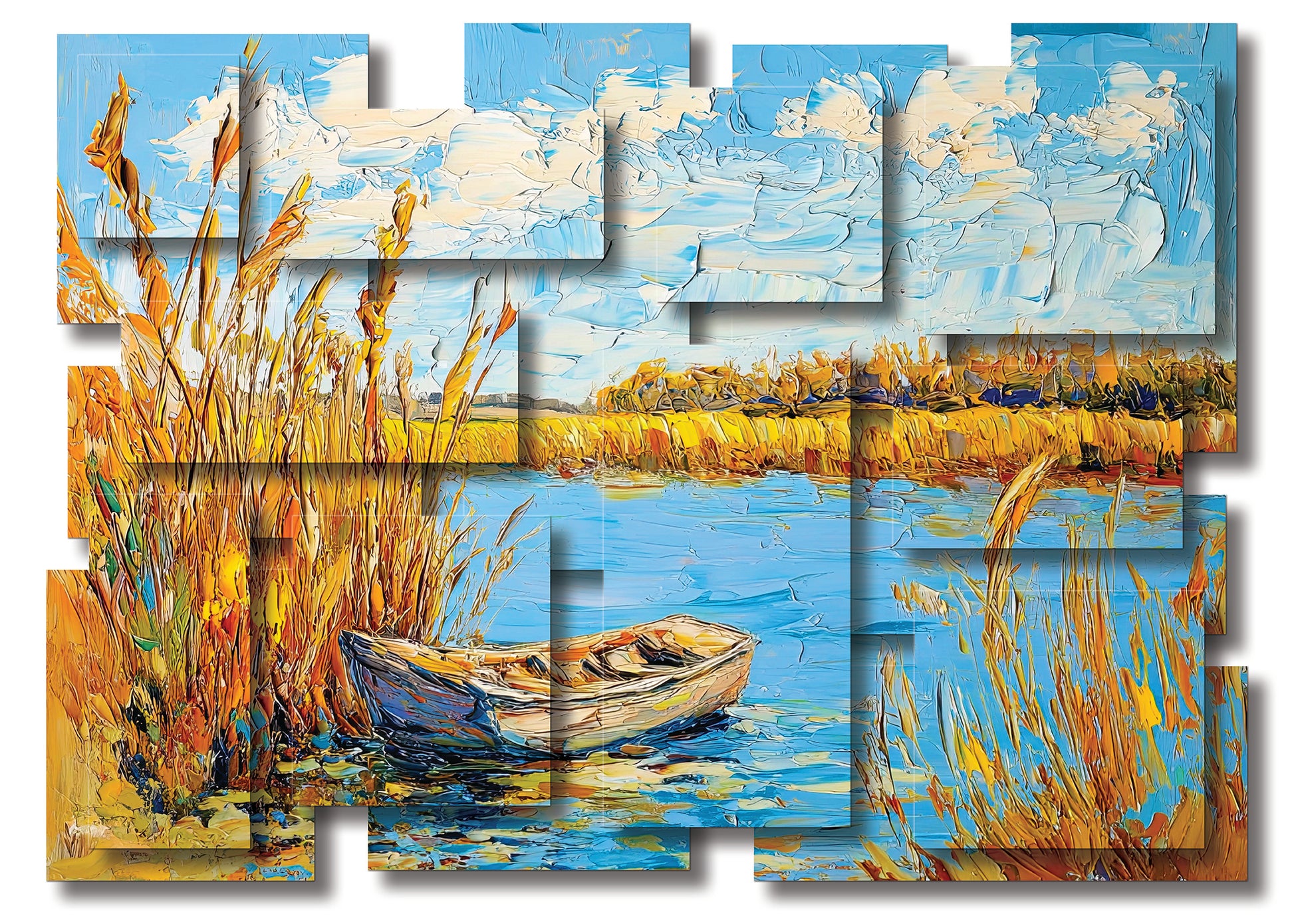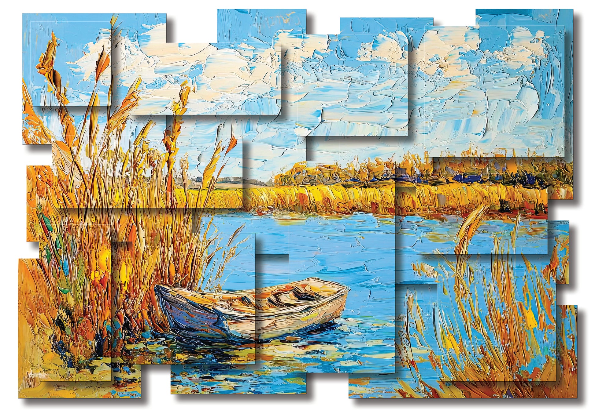 "A serene riverside scene, painted with bold, textured strokes that bring energy to its stillness. Golden reeds sway along the banks, their warm tones contrasting with the cool blues of the water and sky. A small wooden boat rests quietly at the edge, its weathered form reflecting a sense of patience and timelessness. Above, soft clouds drift across a bright sky, completing the composition with an airy balance. The painting evokes peace, solitude, and the quiet beauty of nature’s pauses.