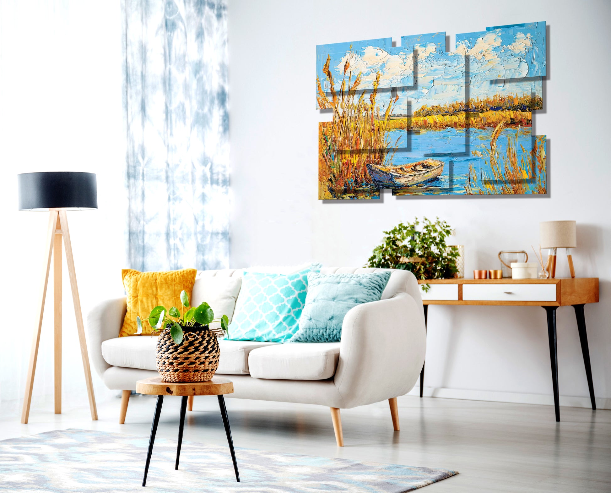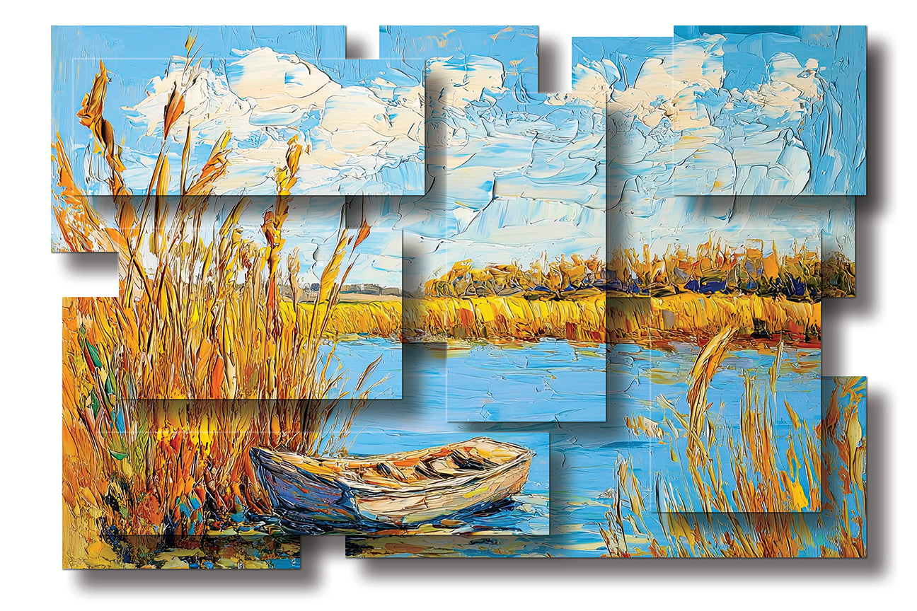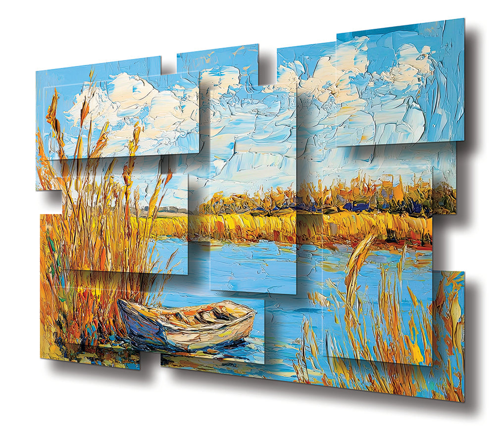 "A serene riverside scene, painted with bold, textured strokes that bring energy to its stillness. Golden reeds sway along the banks, their warm tones contrasting with the cool blues of the water and sky. A small wooden boat rests quietly at the edge, its weathered form reflecting a sense of patience and timelessness. Above, soft clouds drift across a bright sky, completing the composition with an airy balance. The painting evokes peace, solitude, and the quiet beauty of nature’s pauses.