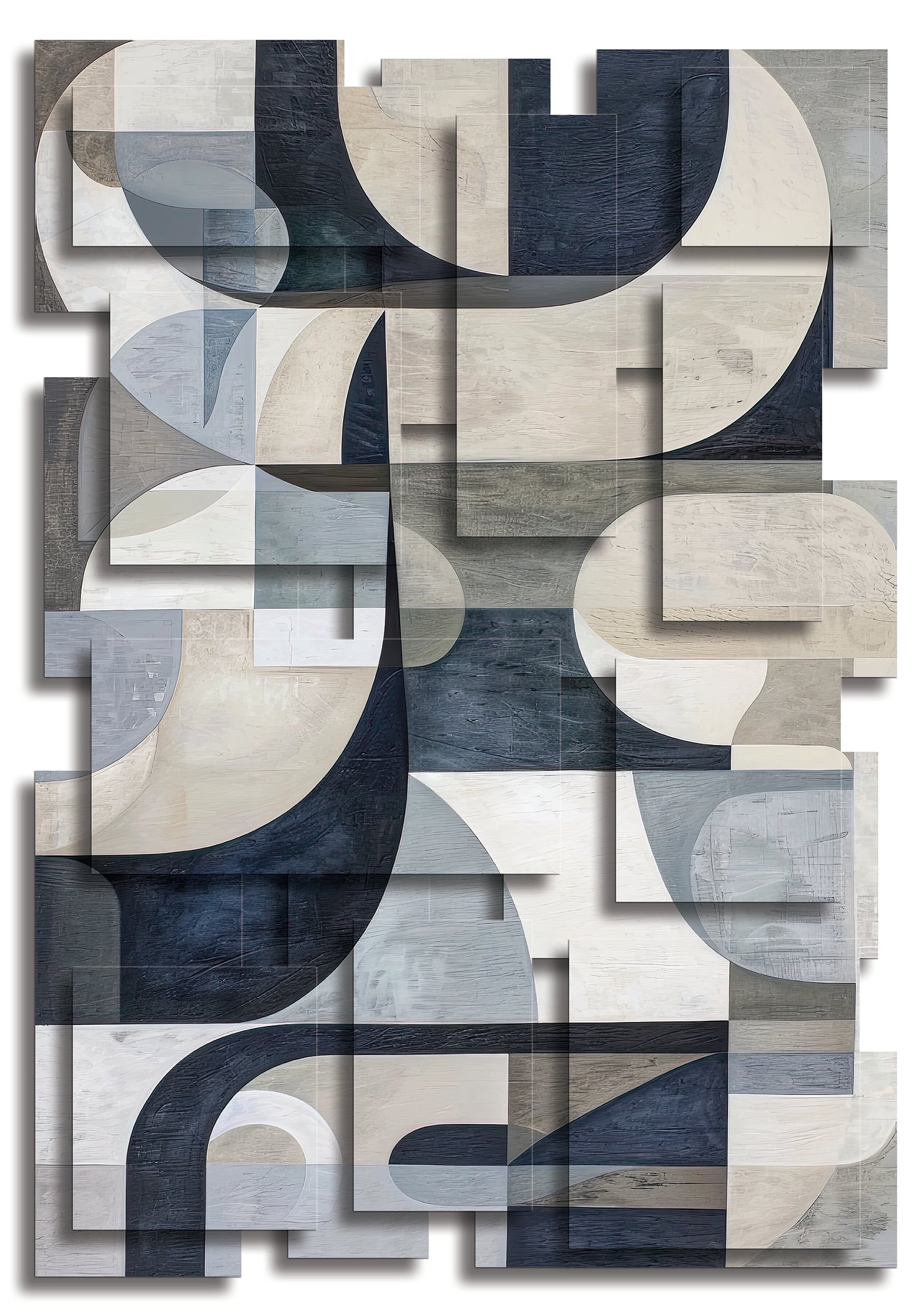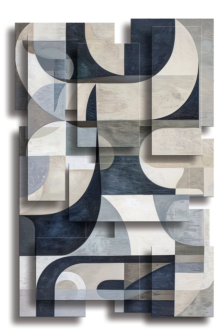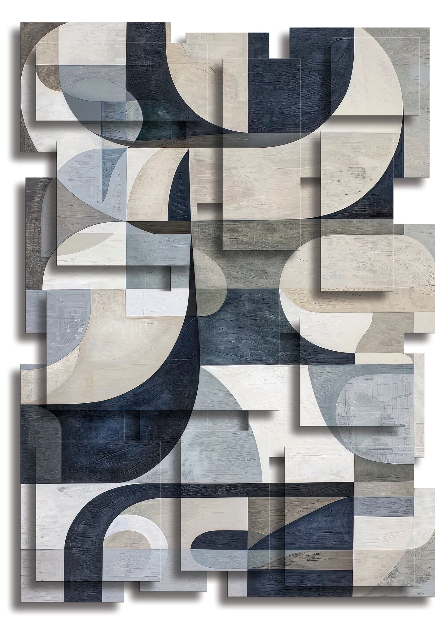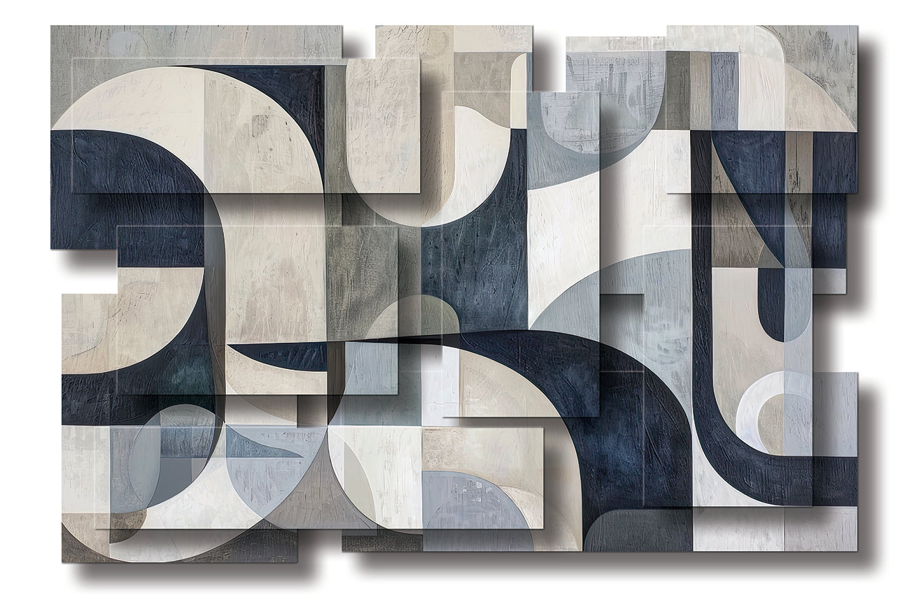 "A refined exploration of geometric abstraction, where soft curves and sharp angles coexist in a carefully balanced composition evoking a quiet sense of harmony and contemplation. The overlapping forms, layers, and subtle tonal shifts create depth without relying on vibrant color, instead drawing attention to structure, balance, and the interplay of light and shadow.