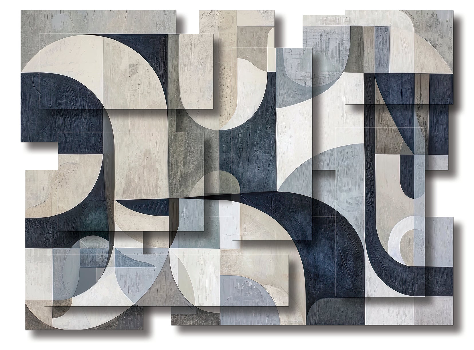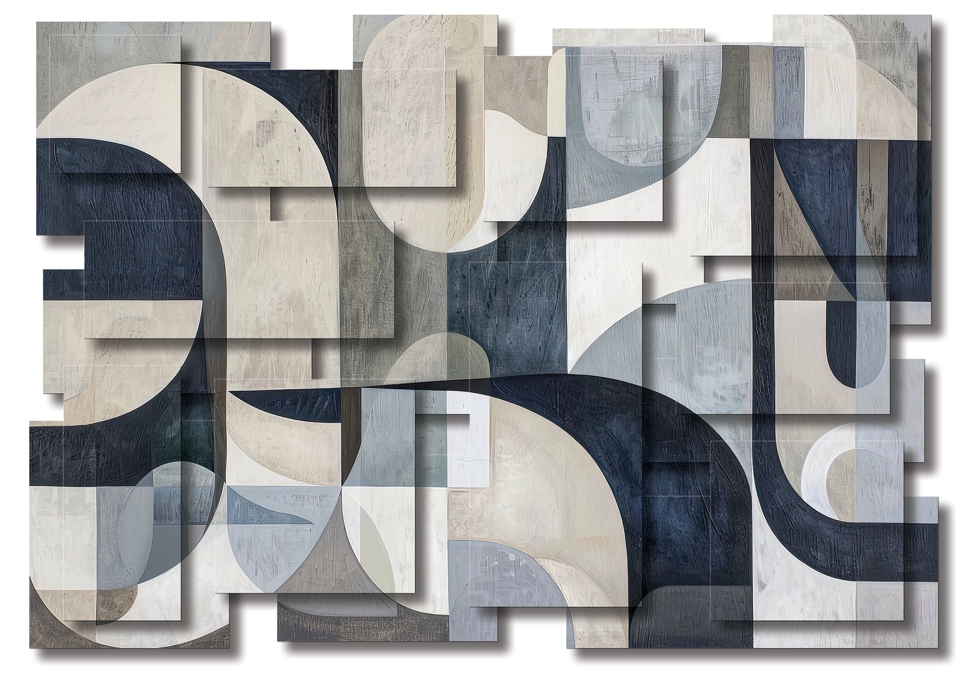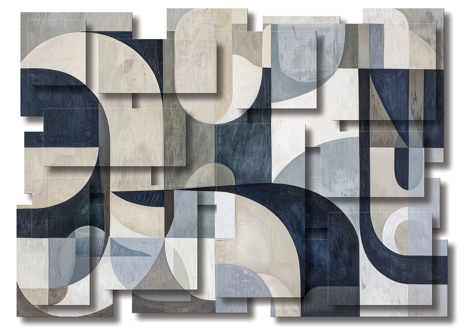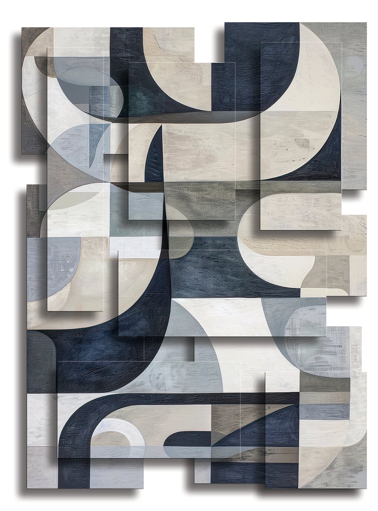 "A refined exploration of geometric abstraction, where soft curves and sharp angles coexist in a carefully balanced composition evoking a quiet sense of harmony and contemplation. The overlapping forms, layers, and subtle tonal shifts create depth without relying on vibrant color, instead drawing attention to structure, balance, and the interplay of light and shadow.