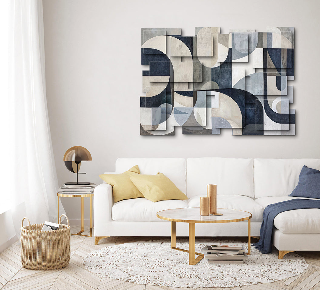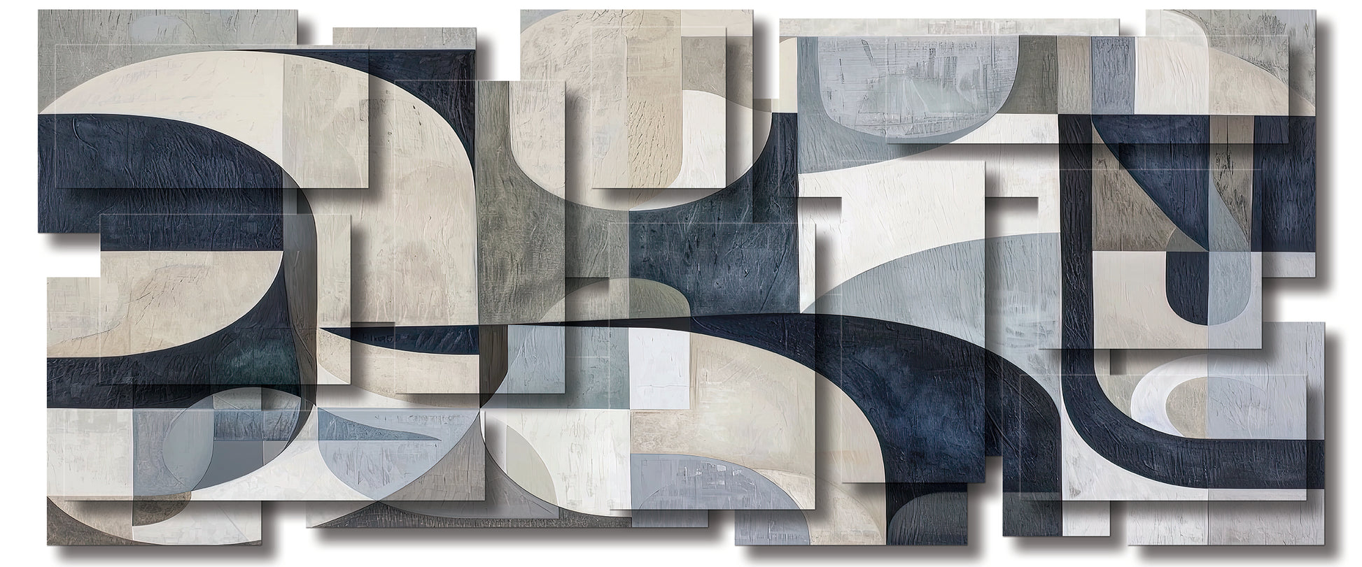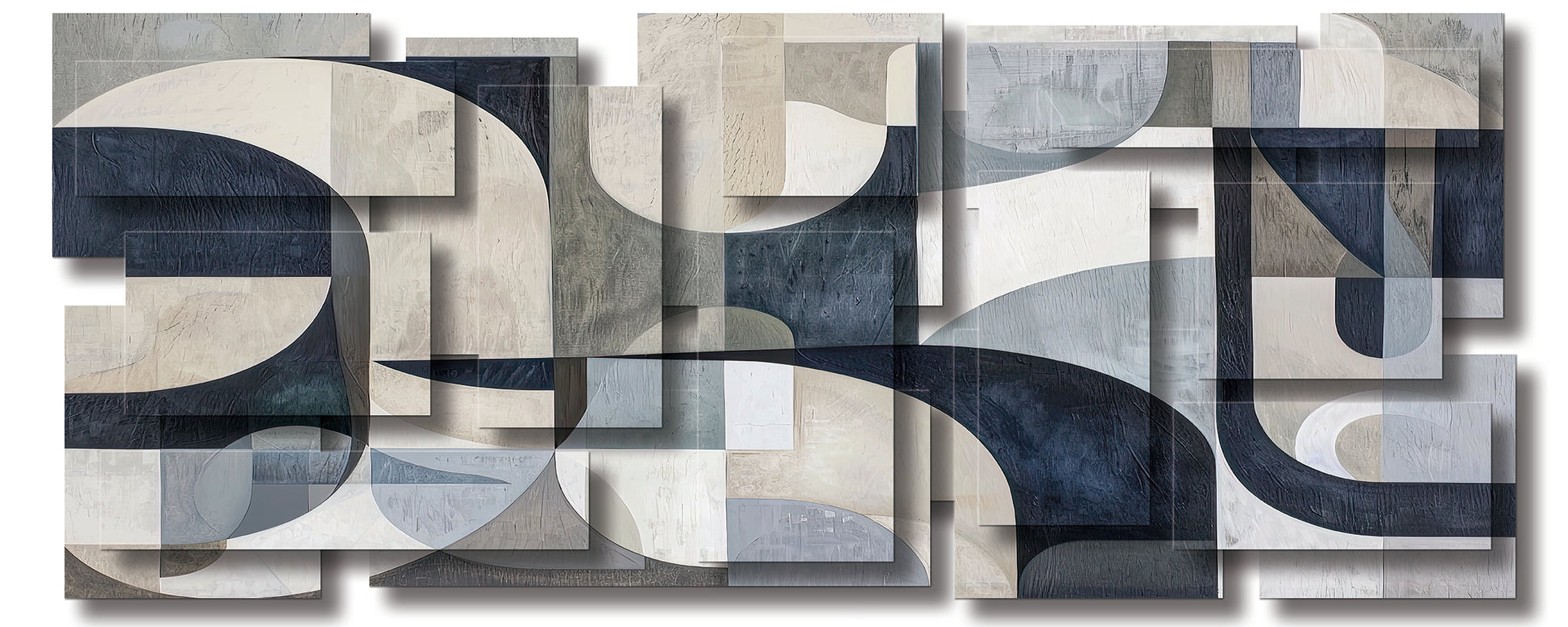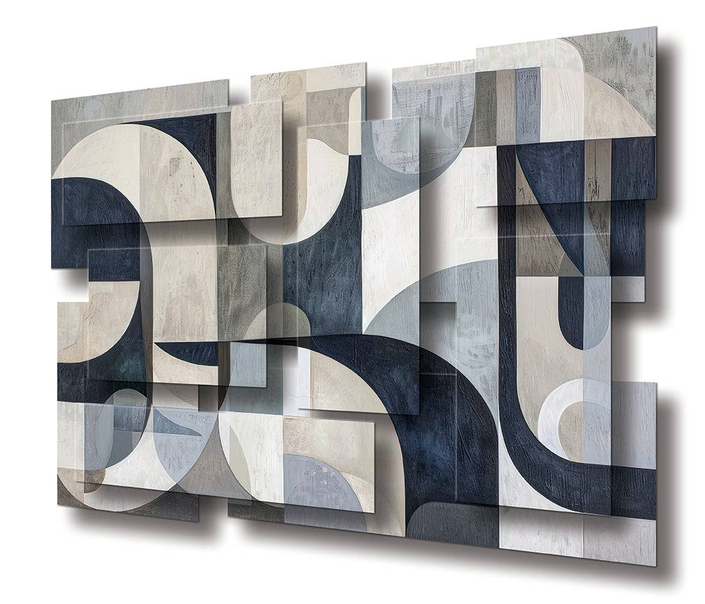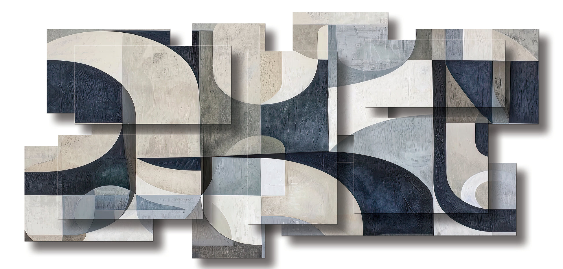 "A refined exploration of geometric abstraction, where soft curves and sharp angles coexist in a carefully balanced composition evoking a quiet sense of harmony and contemplation. The overlapping forms, layers, and subtle tonal shifts create depth without relying on vibrant color, instead drawing attention to structure, balance, and the interplay of light and shadow.