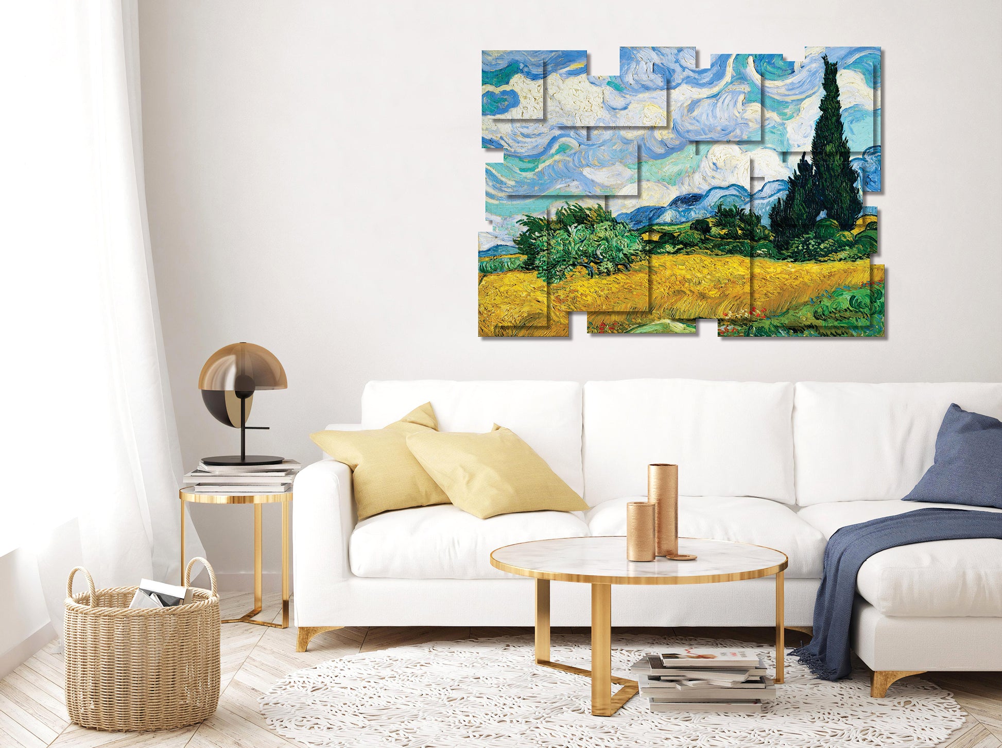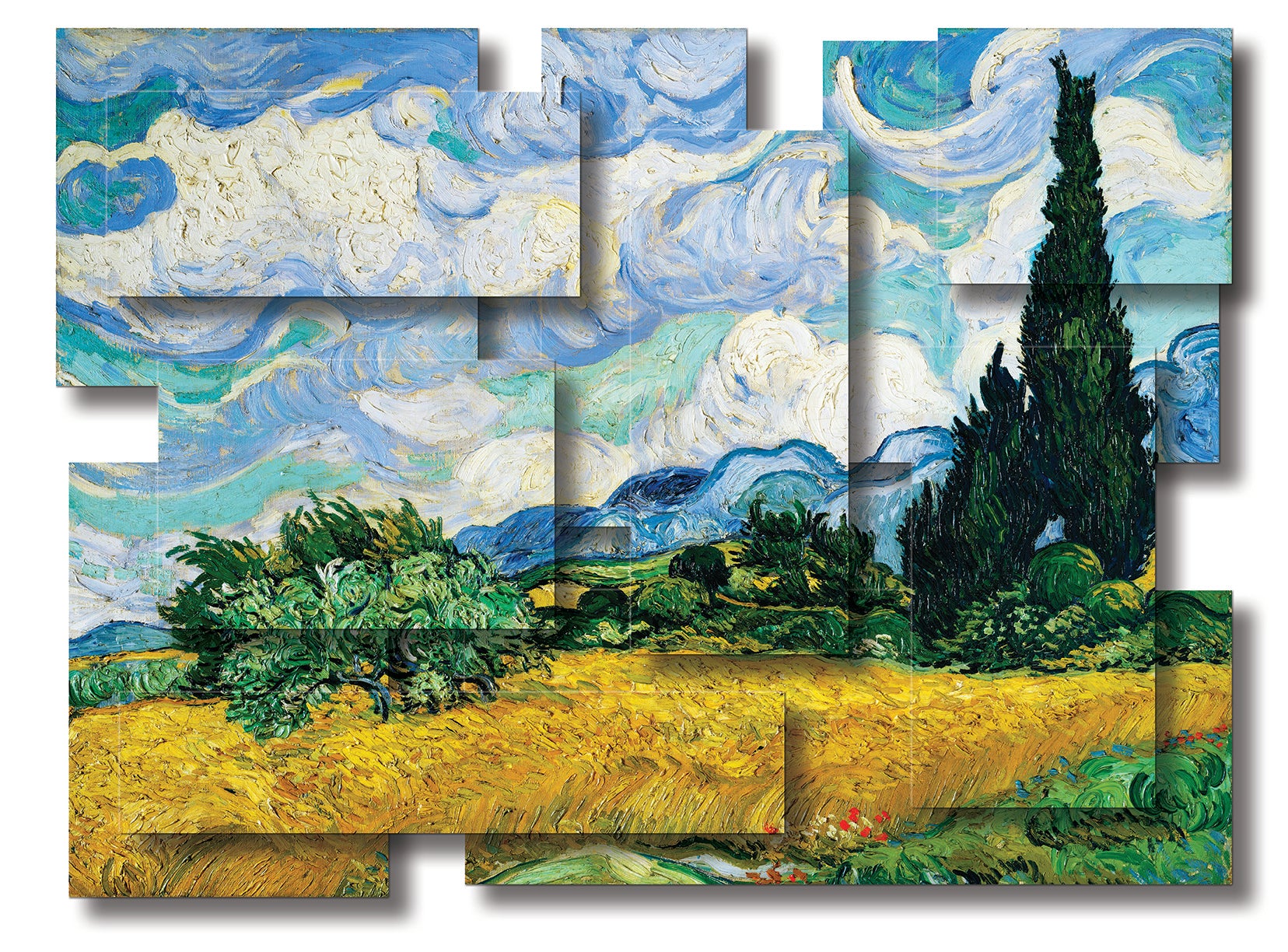 "A sweeping expression of movement, color, and vitality, the scene captures a golden wheat field under a vast, turbulent sky. The swirling clouds roll across the canvas in rhythm with the waves of yellow wheat, blurring the line between earth and sky. At the horizon, deep green cypress trees rise like flames, their bold verticality contrasting with the horizontal sweep of the field. Shades of blue and green bring depth to the distant mountains, while dashes of red flowers in the foreground anchor the composition with subtle detail. The piece radiates Van Gogh’s ability to transform a simple landscape into something alive and spiritual—an interplay of energy, serenity, and intensity that reflects the restless beauty of nature itself.